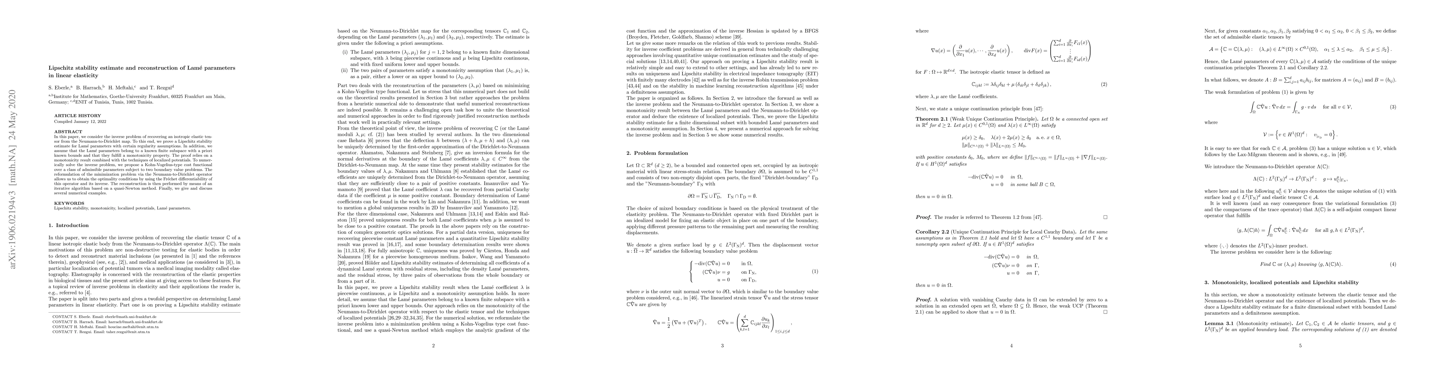 This paper proves a Lipschitz stability estimate for reconstructing isotropic elastic tensors from the Neumann-to-Dirichlet map, assuming known bounds and monotonicity of the Lam\'e parameters. It proposes a Kohn-Vogelius-type cost functional and an iterative quasi-Newton method for numerical reconstruction, supported by numerical examples.