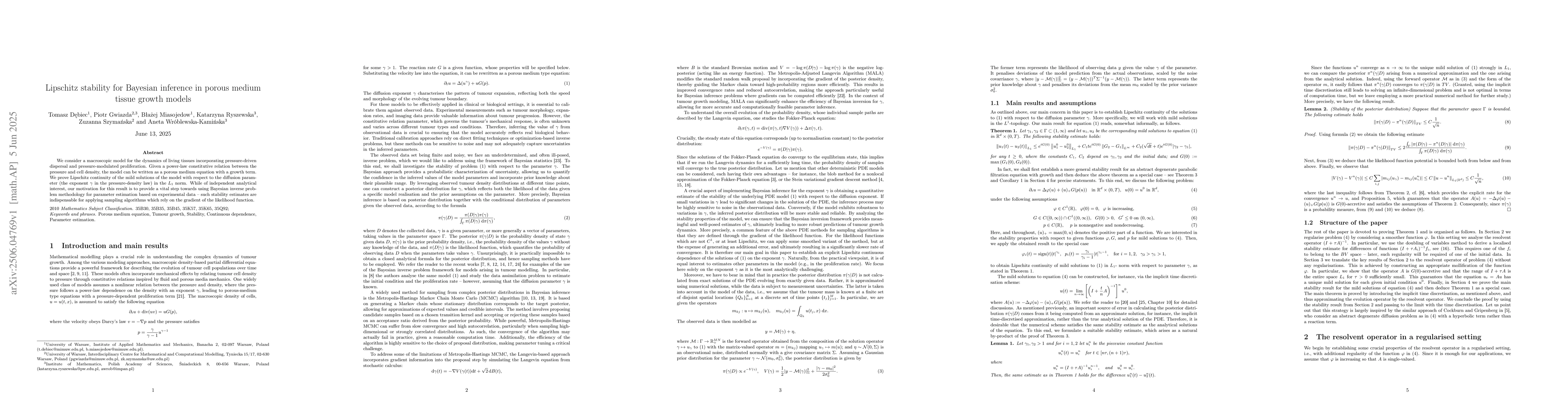 Researchers prove that a model of tissue growth in porous medium is Lipschitz stable with respect to its diffusion parameter, a crucial step for using Bayesian inverse problem methodology in parameter estimation.
