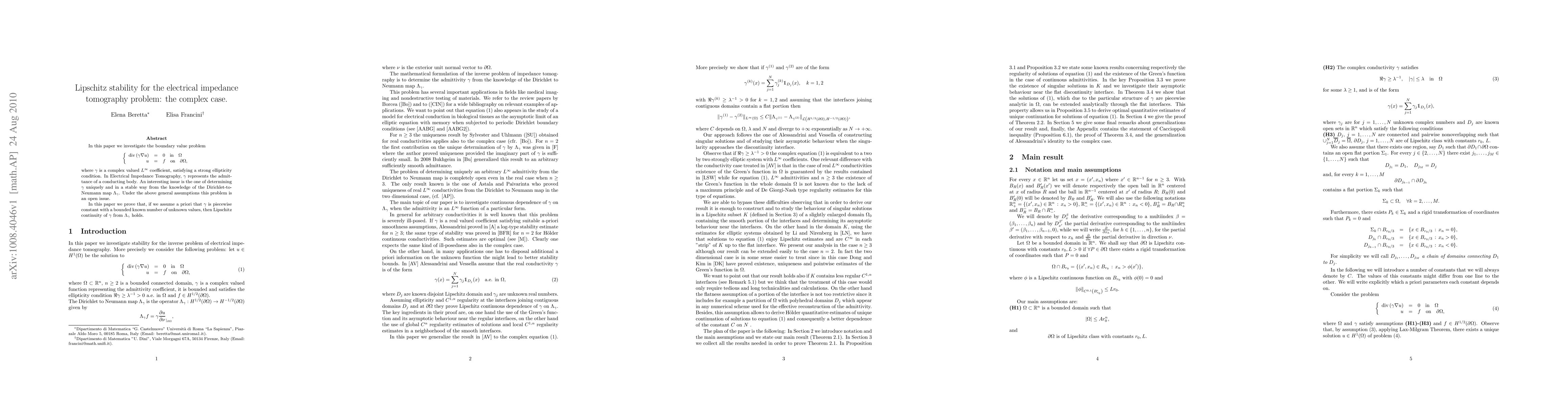 In this paper we investigate the boundary value problem ${div(\gamma\nabla u)=0 in \Omega, u=f on \partial\Omega$ where $\gamma$ is a complex valued $L^\infty$ coefficient, satisfying a strong ellipticity condition. In Electrical Impedance Tomography, $\gamma$ represents the admittance of a conducting body. An interesting issue is the one of determining $\gamma$ uniquely and in a stable way from the knowledge of the Dirichlet-to-Neumann map $\Lambda_\gamma$. Under the above general assumptions this problem is an open issue. In this paper we prove that, if we assume a priori that $\gamma$ is piecewise constant with a bounded known number of unknown values, then Lipschitz continuity of $\gamma$ from $\Lambda_\gamma$ holds.