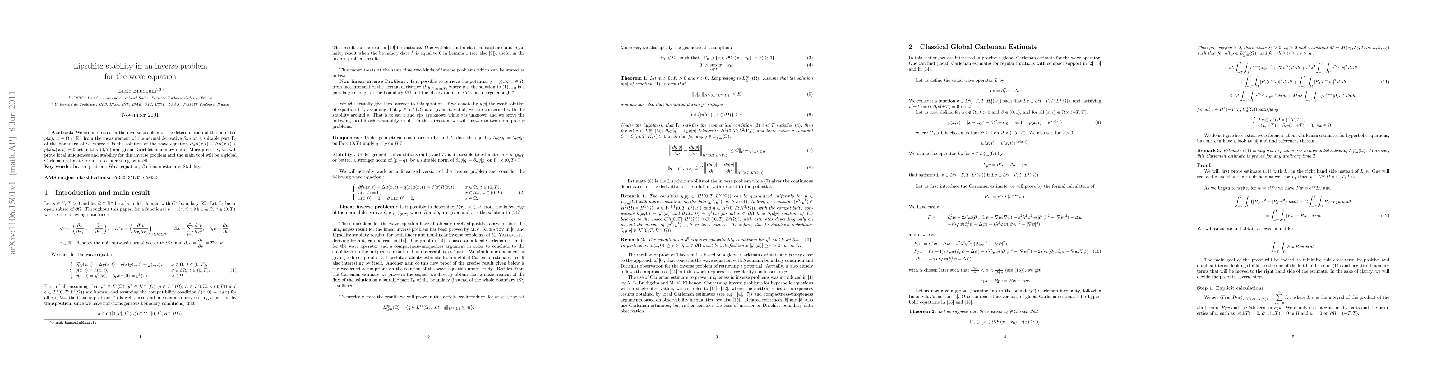 This paper investigates the inverse problem of determining the potential $p(x)$ from measurements of the wave equation's normal derivative on a boundary part. It proves local uniqueness and Lipschitz stability using a global Carleman estimate, which is an independently valuable result.