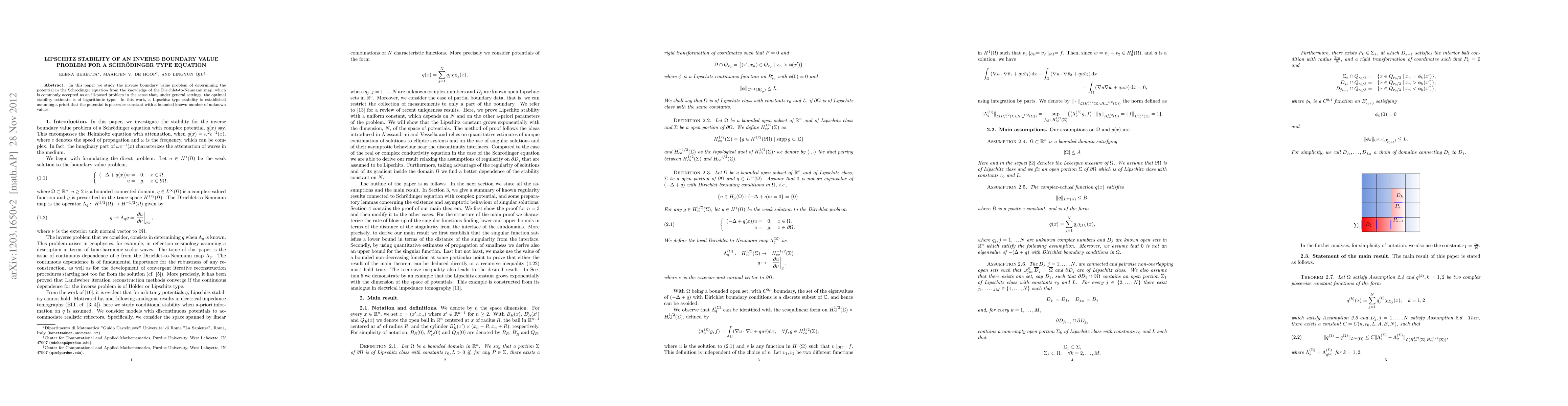 This paper investigates the inverse boundary value problem for a Schrödinger type equation, focusing on determining the potential from the Dirichlet-to-Neumann map. It establishes Lipschitz stability under the assumption that the potential is piecewise constant with a limited number of unknown values.