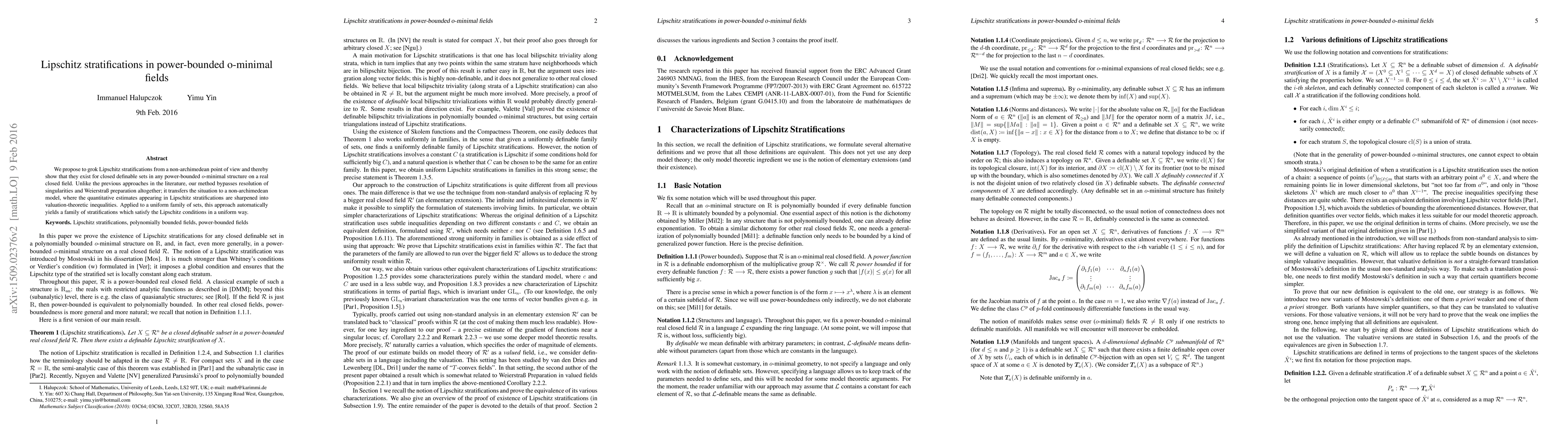 We propose to grok Lipschitz stratifications from a non-archimedean point of view and thereby show that they exist for closed definable sets in any power-bounded o-minimal structure on a real closed field. Unlike the previous approaches in the literature, our method bypasses resolution of singularities and Weierstrass preparation altogether; it transfers the situation to a non-archimedean model, where the quantitative estimates appearing in Lipschitz stratifications are sharpened into valuation-theoretic inequalities. Applied to a uniform family of sets, this approach automatically yields a family of stratifications which satisfy the Lipschitz conditions in a uniform way.