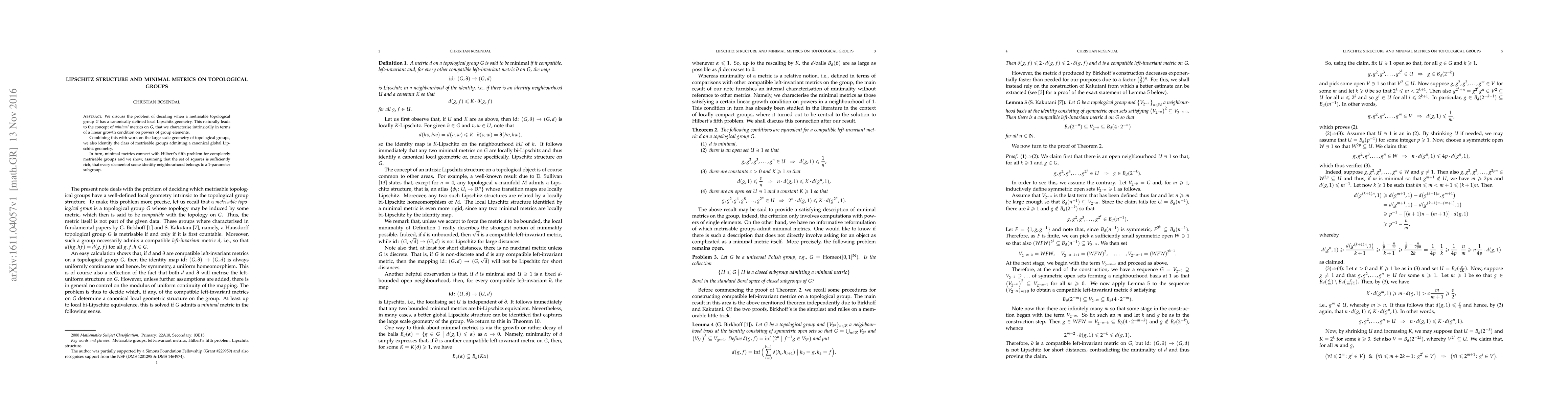 We discuss the problem of deciding when a metrisable topological group $G$ has a canonically defined local Lipschitz geometry. This naturally leads to the concept of minimal metrics on $G$, that we characterise intrinsically in terms of a linear growth condition on powers of group elements. Combining this with work on the large scale geometry of topological groups, we also identify the class of metrisable groups admitting a canonical global Lipschitz geometry. In turn, minimal metrics connect with Hilbert's fifth problem for completely metrisable groups and we show, assuming that the set of squares is sufficiently rich, that every element of some identity neighbourhood belongs to a $1$-parameter subgroup.