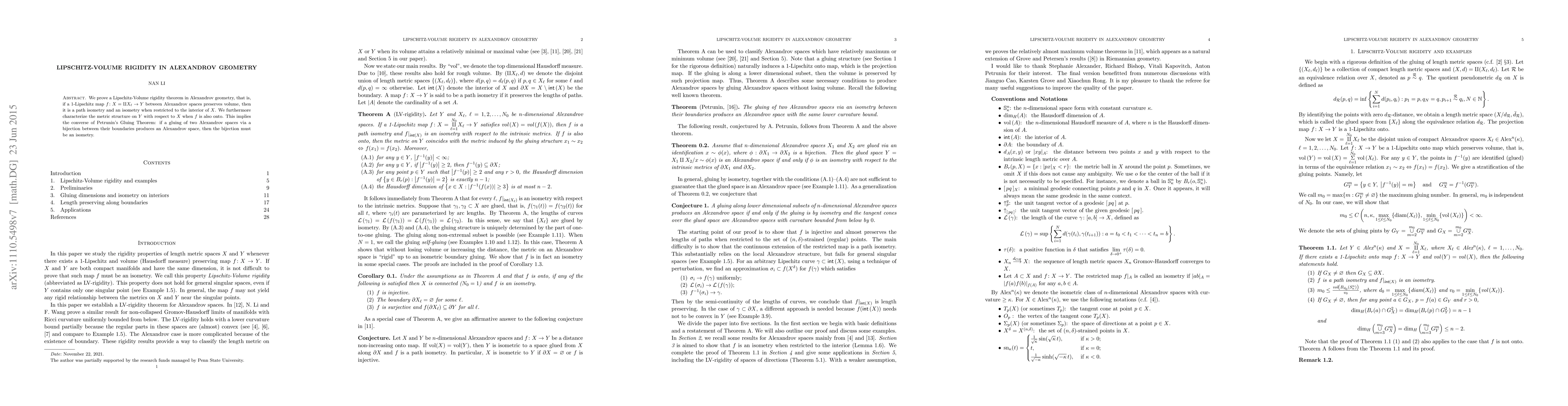The paper proves a Lipschitz-Volume rigidity theorem in Alexandrov geometry, showing that volume-preserving 1-Lipschitz maps are path isometries on the interiors of the involved spaces. It also characterizes the metric structure on the target space when the map is onto, thereby implying the converse of Petrunin's Gluing Theorem.