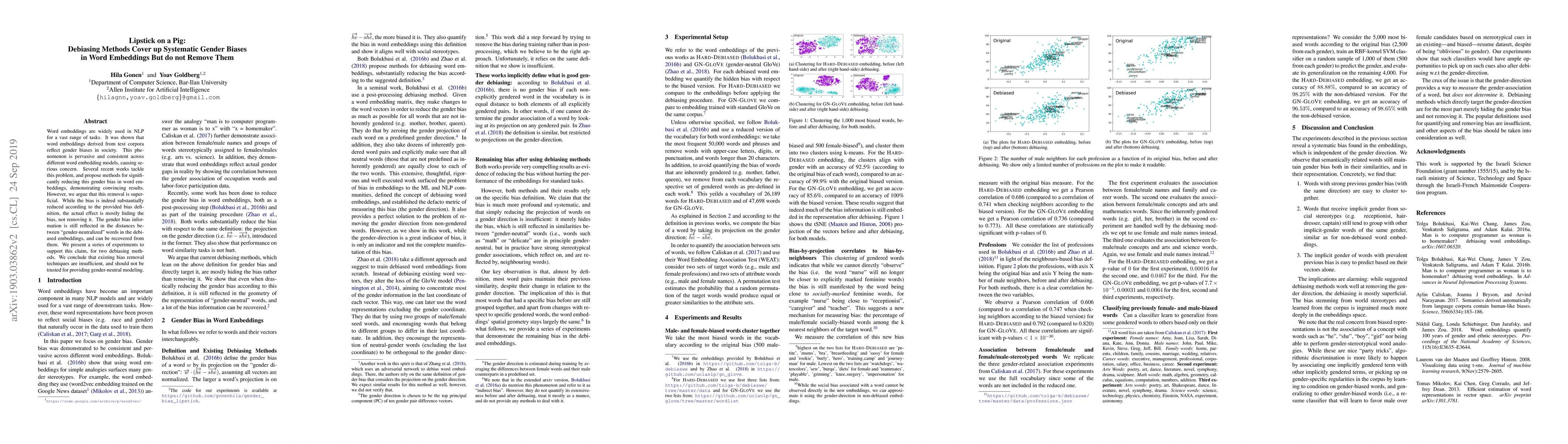 Word embeddings are widely used in NLP for a vast range of tasks. It was shown that word embeddings derived from text corpora reflect gender biases in society. This phenomenon is pervasive and consistent across different word embedding models, causing serious concern. Several recent works tackle this problem, and propose methods for significantly reducing this gender bias in word embeddings, demonstrating convincing results. However, we argue that this removal is superficial. While the bias is indeed substantially reduced according to the provided bias definition, the actual effect is mostly hiding the bias, not removing it. The gender bias information is still reflected in the distances between "gender-neutralized" words in the debiased embeddings, and can be recovered from them. We present a series of experiments to support this claim, for two debiasing methods. We conclude that existing bias removal techniques are insufficient, and should not be trusted for providing gender-neutral modeling.