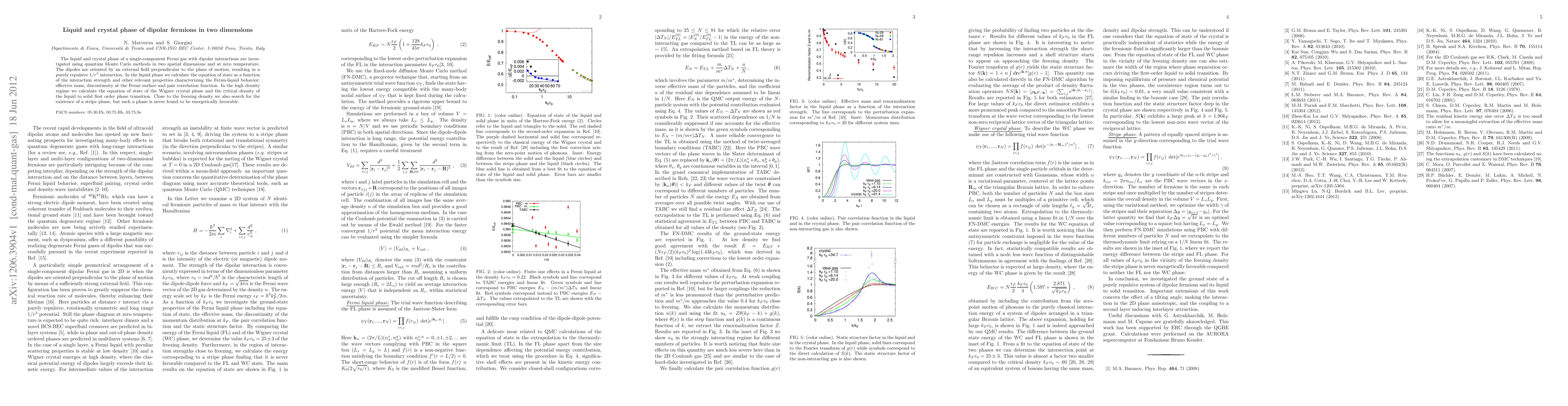 This paper investigates the liquid and crystal phases of dipolar fermions in two dimensions using quantum Monte Carlo methods, revealing the equation of state, effective mass, and Fermi-liquid properties in the liquid phase, and the equation of state and phase transition density in the Wigner crystal phase, with no evidence of a stripe phase.
