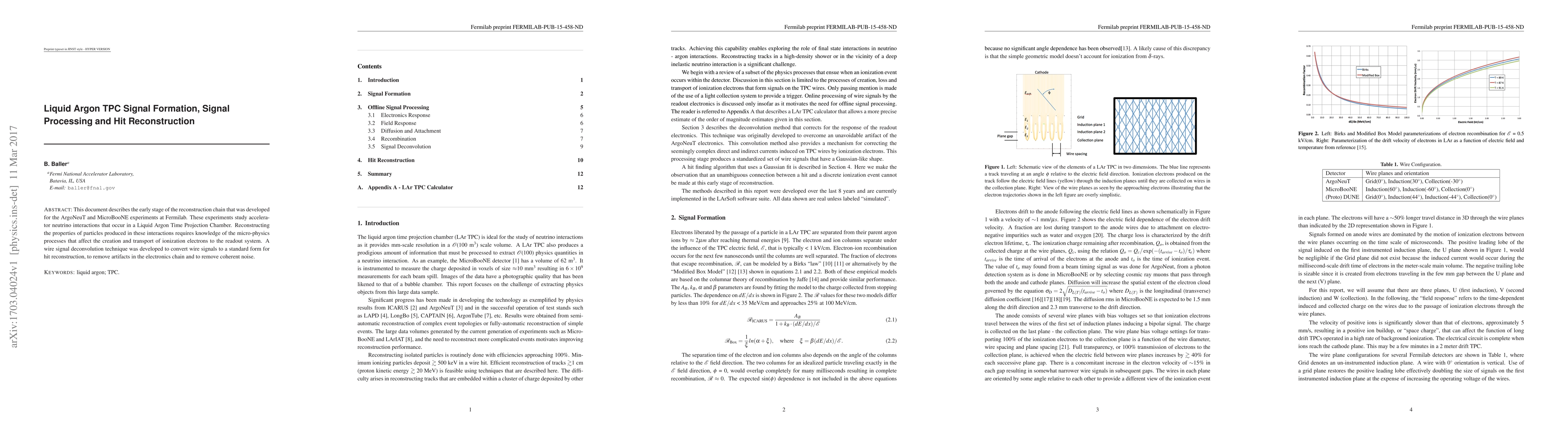 This document describes the early stage of the reconstruction chain that was developed for the ArgoNeuT and MicroBooNE experiments at Fermilab. These experiments study accelerator neutrino interactions that occur in a Liquid Argon Time Projection Chamber. Reconstructing the properties of particles produced in these interactions requires knowledge of the micro-physics processes that affect the creation and transport of ionization electrons to the readout system. A wire signal deconvolution technique was developed to convert wire signals to a standard form for hit reconstruction, to remove artifacts in the electronics chain and to remove coherent noise.
