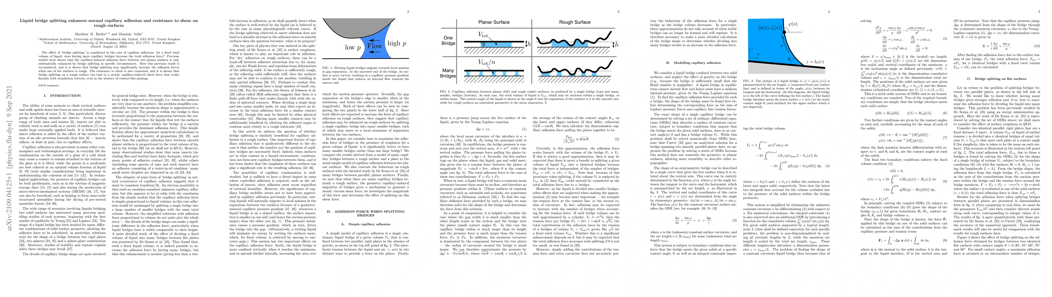 **Summary:** This study demonstrates that splitting a liquid bridge into multiple capillary bridges significantly enhances normal capillary adhesion and resistance to shear when one surface is rough. The adhesion force increases due to bridge splitting, and the resistance to shear exhibits a linear relationship with translation velocity, even without contact-line pinning.