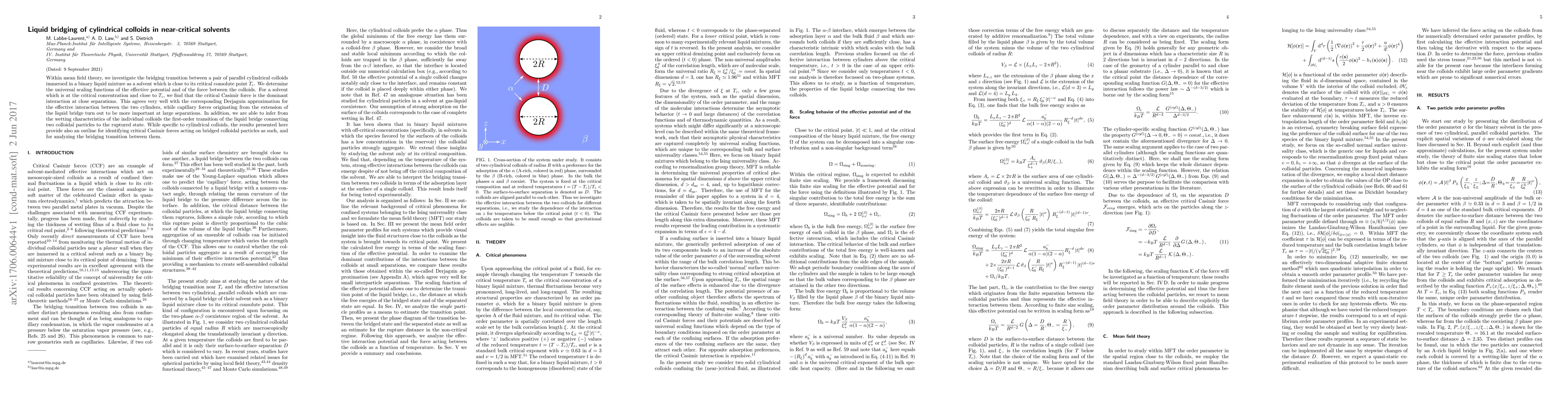 This paper investigates the bridging transition between cylindrical colloids in near-critical solvents, determining universal scaling functions and the dominant interactions. It finds that critical Casimir forces dominate at close separations, while capillary forces are more significant at larger separations.