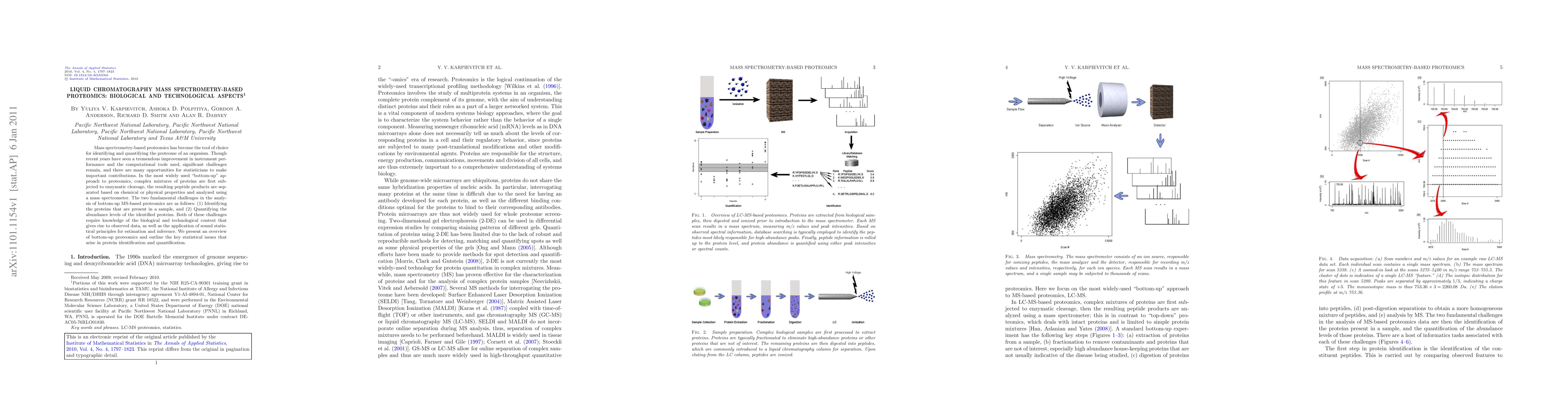 This paper reviews mass spectrometry-based proteomics, focusing on the "bottom-up" approach where proteins are enzymatically cleaved into peptides for analysis. It highlights the challenges in protein identification and quantification, emphasizing the need for statistical methods to address biological and technological complexities.