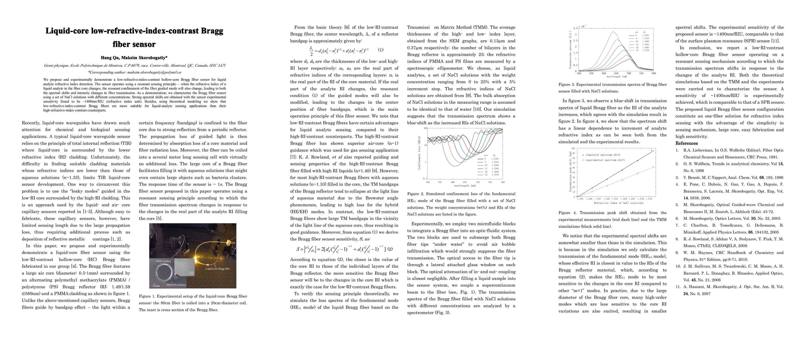 This paper proposes a hollow-core Bragg fiber sensor with low-refractive-index-contrast for detecting liquid analytes, showing strong spectral shifts and high sensitivity (~1400nm/RIU). Theoretical modeling indicates that these sensors are more suitable for liquid sensing compared to high-refractive-index-contrast counterparts.