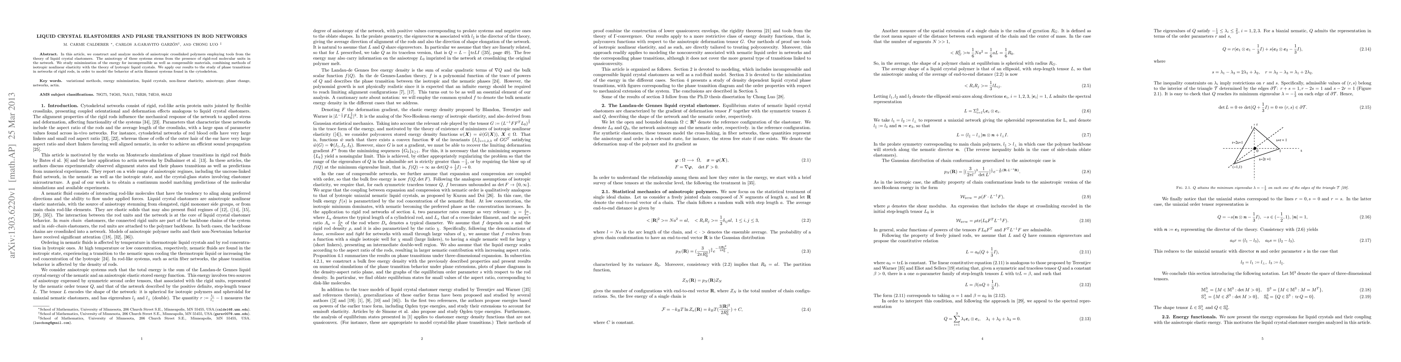This paper develops models for anisotropic crosslinked polymers using liquid crystal elastomer theory, focusing on the behavior of incompressible and compressible materials. It combines nonlinear elasticity and liquid crystal theory to study phase transitions in rod networks, aiming to model actin filament systems in the cytoskeleton.