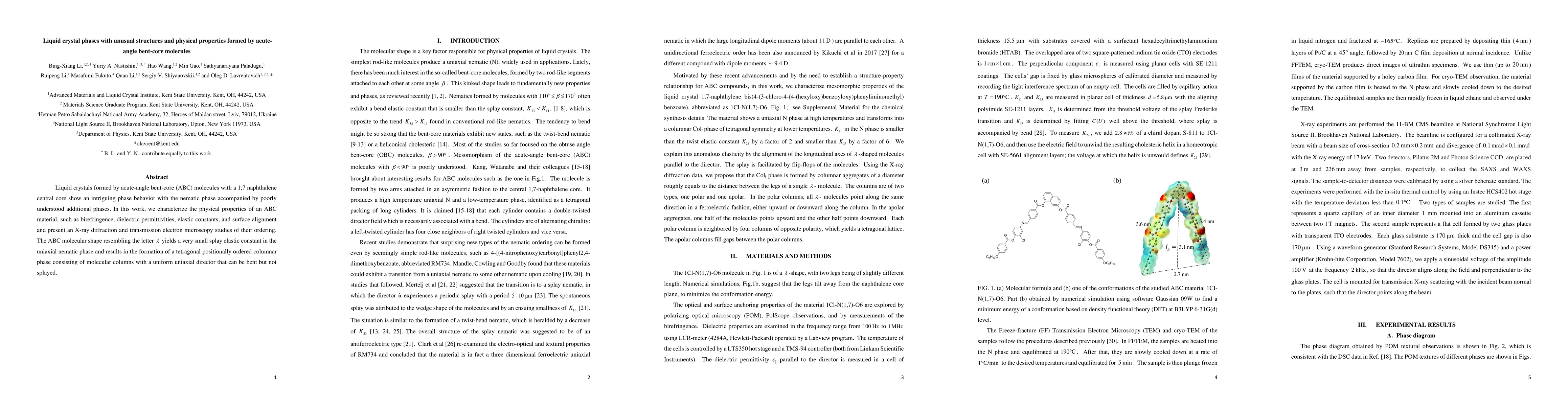 This paper investigates the unique liquid crystal phases formed by acute-angle bent-core molecules with a 1,7 naphthalene central core, revealing additional phases alongside the nematic phase. The study characterizes the material's birefringence, dielectric properties, elastic constants, and surface alignment, and identifies a tetragonal columnar phase with a small splay elastic constant.