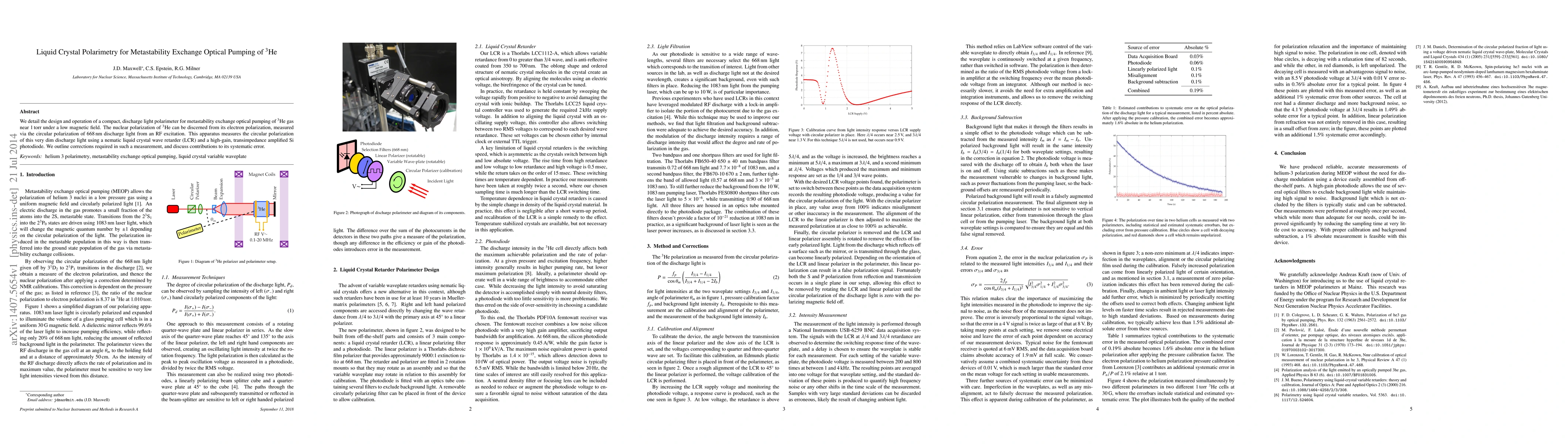 We detail the design and operation of a compact, discharge light polarimeter for metastability exchange optical pumping of 3He gas near 1 torr under a low magnetic field. The nuclear polarization of 3He can be discerned from its electron polarization, measured via the circular polarization of 668 nm discharge light from an RF excitation. This apparatus measures the circular polarization of this very dim discharge light using a nematic liquid crystal wave retarder (LCR) and a high-gain, transimpedance amplified Si photodiode. We outline corrections required in such a measurement, and discuss contributions to its systematic error.