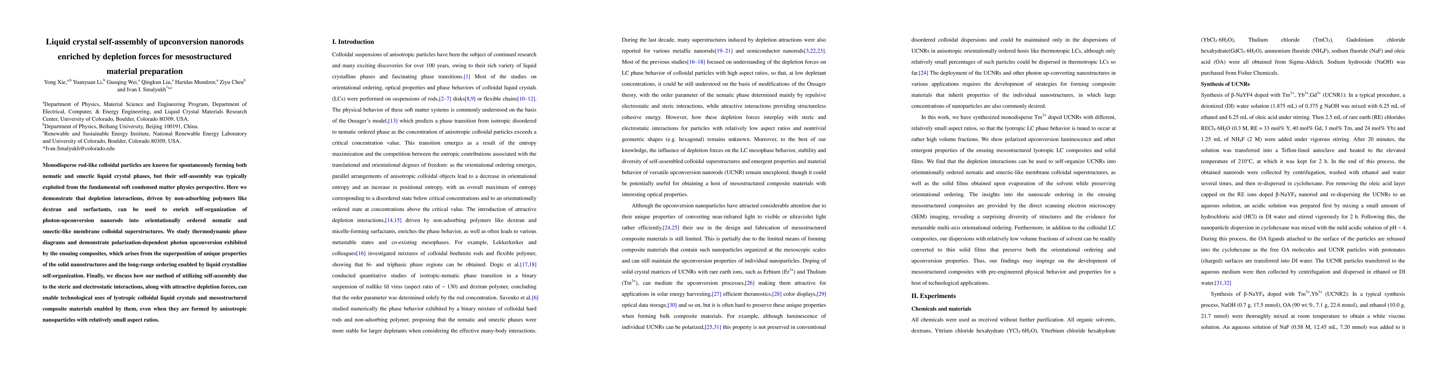 This paper explores the self-assembly of upconversion nanorods into nematic and smectic phases using depletion forces from non-adsorbing polymers, leading to mesostructured composites with polarization-dependent photon upconversion. The method leverages steric and electrostatic interactions to create technologically useful lyotropic colloidal liquid crystals.
