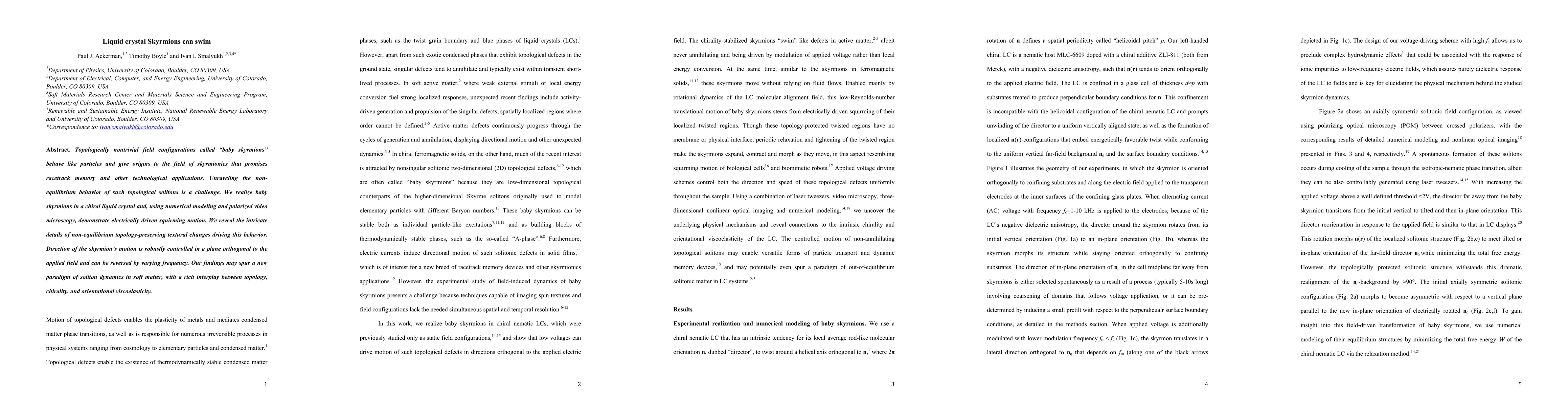 Topologically nontrivial field configurations called "baby skyrmions" behave like particles and give origins to the field of skyrmionics that promises racetrack memory and other technological applications. Unraveling the non-equilibrium behavior of such topological solitons is a challenge. We realize baby skyrmions in a chiral liquid crystal and, using numerical modeling and polarized video microscopy, demonstrate electrically driven squirming motion. We reveal the intricate details of non-equilibrium topology-preserving textural changes driving this behavior. Direction of the skyrmion's motion is robustly controlled in a plane orthogonal to the applied field and can be reversed by varying frequency. Our findings may spur a new paradigm of soliton dynamics in soft matter, with a rich interplay between topology, chirality, and orientational viscoelasticity.