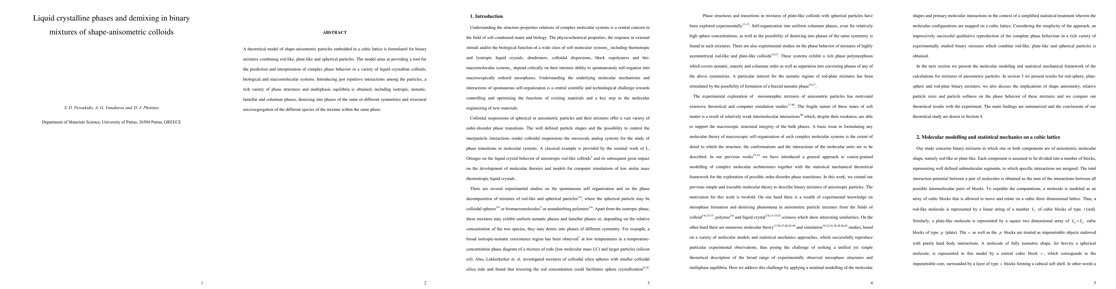 This paper presents a theoretical model for binary mixtures of shape-anisometric particles, predicting diverse liquid crystalline phases and demixing behaviors, including isotropic, nematic, lamellar, and columnar phases, driven by simple repulsive interactions. The model aims to interpret complex phase behaviors in colloidal, biological, and macromolecular systems.