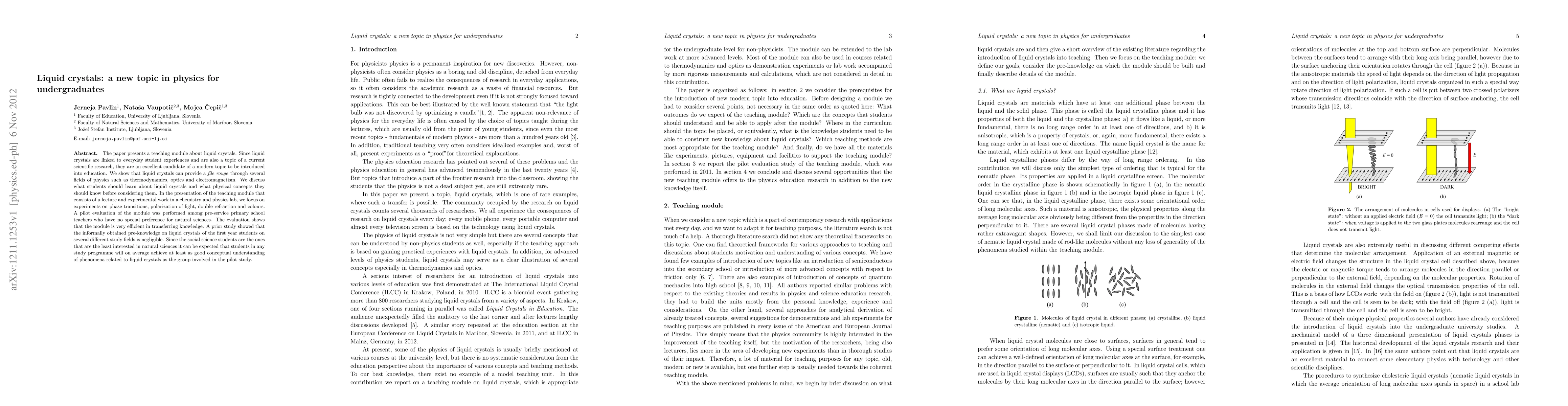 The paper presents a teaching module about liquid crystals. Since liquid crystals are linked to everyday student experiences and are also a topic of a current scientific research, they are an excellent candidate of a modern topic to be introduced into education. We show that liquid crystals can provide a file rouge through several fields of physics such as thermodynamics, optics and electromagnetism. We discuss what students should learn about liquid crystals and what physical concepts they should know before considering them. In the presentation of the teaching module that consists of a lecture and experimental work in a chemistry and physics lab, we focus on experiments on phase transitions, polarization of light, double refraction and colours. A pilot evaluation of the module was performed among pre-service primary school teachers who have no special preference for natural sciences. The evaluation shows that the module is very efficient in transferring knowledge. A prior study showed that the informally obtained pre-knowledge on liquid crystals of the first year students on several different study fields is negligible. Since the social science students are the ones that are the least interested in natural sciences it can be expected that students in any study programme will on average achieve at least as good conceptual understanding of phenomena related to liquid crystals as the group involved in the pilot study.