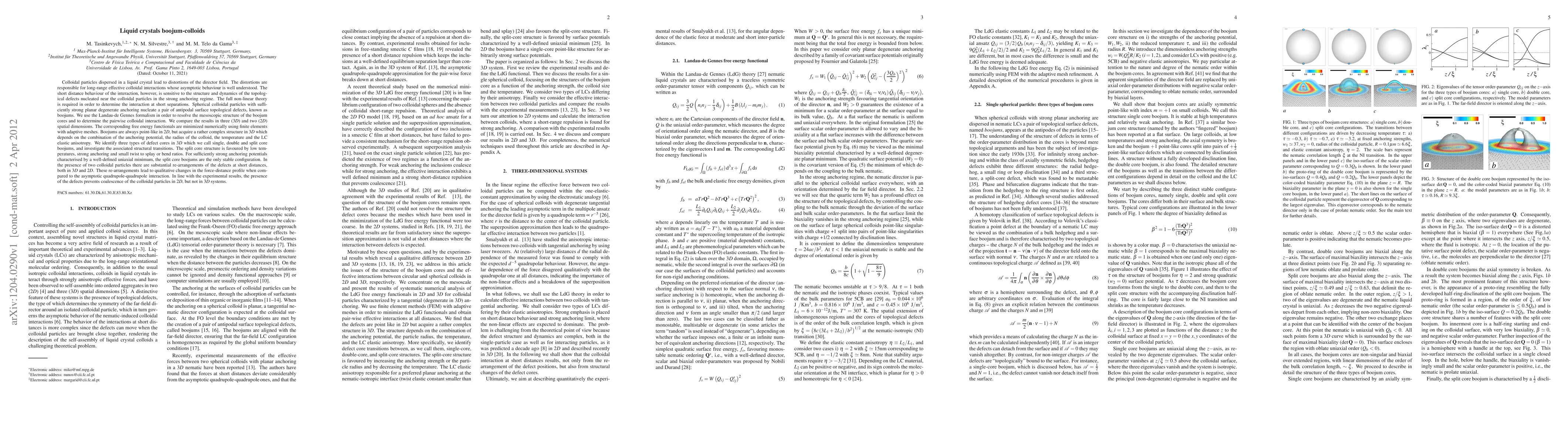 Colloidal particles dispersed in a liquid crystal lead to distortions of the director field. The distortions are responsible for long-range effective colloidal interactions whose asymptotic behaviour is well understood. The short distance behaviour of the interaction, however, is sensitive to the structure and dynamics of the topological defects nucleated near the colloidal particles in the strong anchoring regime. The full non-linear theory is required in order to determine the interaction at short separations. Spherical colloidal particles with sufficiently strong planar degenerate anchoring nucleate a pair of antipodal surface topological defects, known as boojums. We use the Landau-de Gennes formalism in order to resolve the mesoscopic structure of the boojum cores and to determine the pairwise colloidal interaction. We compare the results in three (3D) and two (2D) spatial dimensions. The corresponding free energy functionals are minimized numerically using finite elements with adaptive meshes. Boojums are always point-like in 2D, but acquire a rather complex structure in 3D which depends on the combination of the anchoring potential, the radius of the colloid, the temperature and the LC elastic anisotropy. We identify three types of defect cores in 3D which we call single, double and split core boojums, and investigate the associated structural transitions. In the presence of two colloidal particles there are substantial re-arrangements of the defects at short distances, both in 3D and 2D. These re-arrangements lead to qualitative changes in the force-distance profile when compared to the asymptotic quadrupole-quadrupole interaction. In line with the experimental results, the presence of the defects prevents coalescence of the colloidal particles in 2D, but not in 3D systems.
