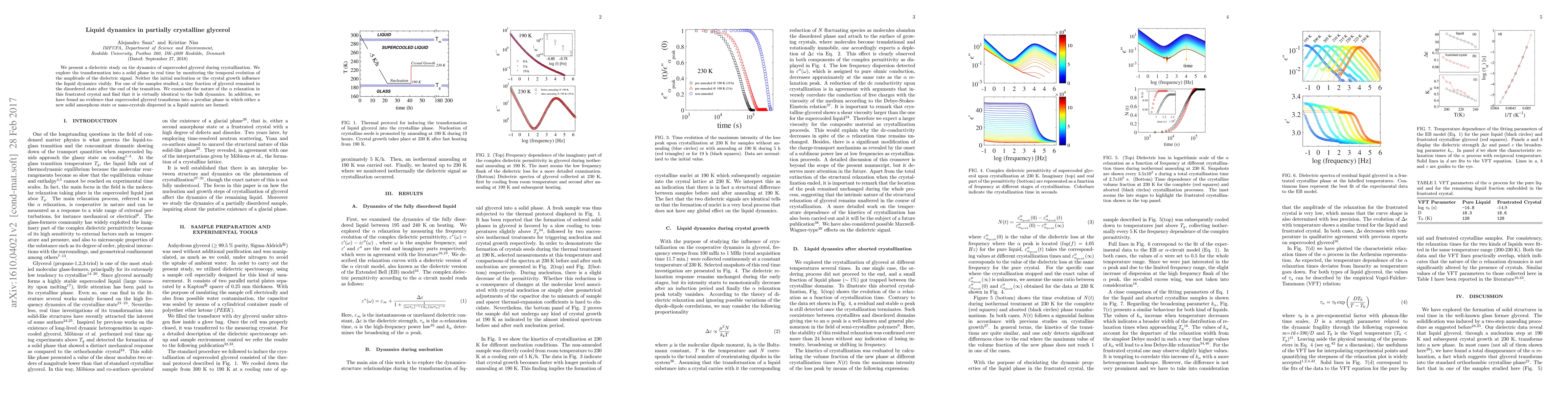 This study investigates the dielectric dynamics of supercooled glycerol during crystallization, finding no significant changes in liquid dynamics during nucleation or growth. A small disordered fraction post-transition shows alpha relaxation similar to bulk dynamics, indicating no formation of new amorphous solid or nano-crystal phases.