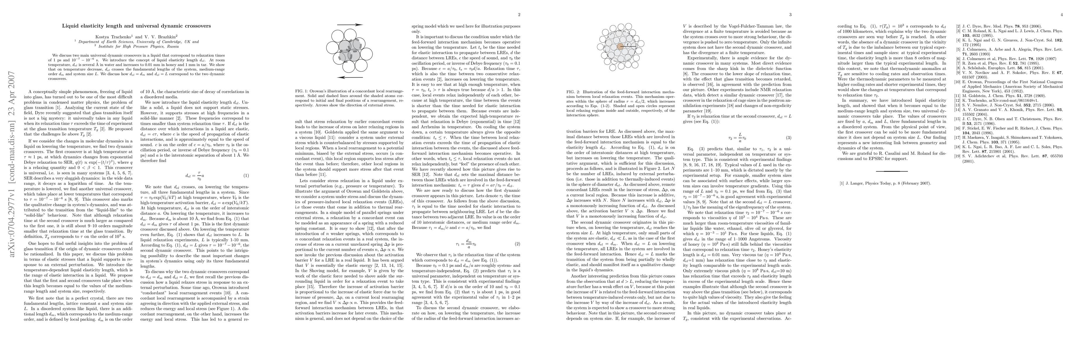 We discuss two main universal dynamic crossovers in a liquid that correspond to relaxation times of 1 ps and $10^{-7}-10^{-6}$ s. We introduce the concept of liquid elasticity length $d_{el}$. At room temperature, $d_{el}$ is several \AA in water and increases to 0.01 mm in honey and 1 mm in tar. We show that on temperature decrease, $d_{el}$ crosses the fundamental lengths of the system, medium-range order $d_m$ and system size $L$. We discuss how $d_{el}=d_m$ and $d_{el}=L$ correspond to the two dynamic crossovers.