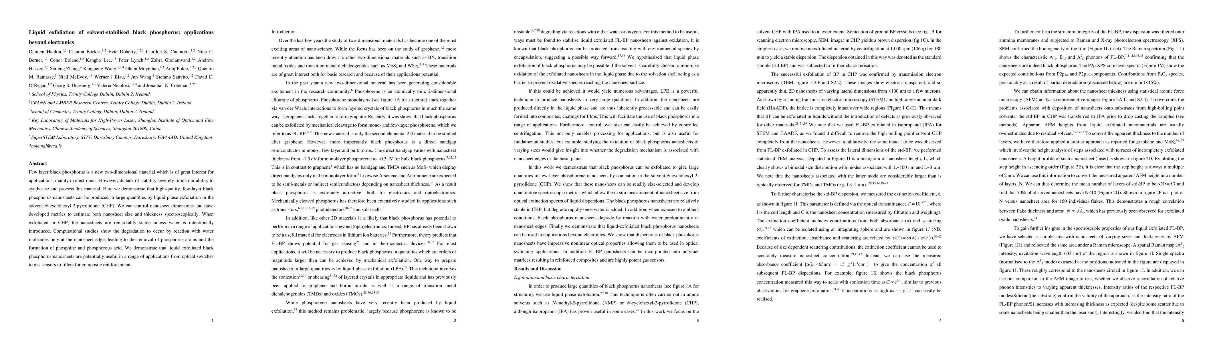 Few layer black phosphorus is a new two-dimensional material which is of great interest for applications, mainly in electronics. However, its lack of stability severely limits our ability to synthesise and process this material. Here we demonstrate that high-quality, few-layer black phosphorus nanosheets can be produced in large quantities by liquid phase exfoliation in the solvent N-cyclohexyl-2-pyrrolidone (CHP). We can control nanosheet dimensions and have developed metrics to estimate both nanosheet size and thickness spectroscopically. When exfoliated in CHP, the nanosheets are remarkably stable unless water is intentionally introduced. Computational studies show the degradation to occur by reaction with water molecules only at the nanosheet edge, leading to the removal of phosphorus atoms and the formation of phosphine and phosphorous acid. We demonstrate that liquid exfoliated black phosphorus nanosheets are potentially useful in a range of applications from optical switches to gas sensors to fillers for composite reinforcement.