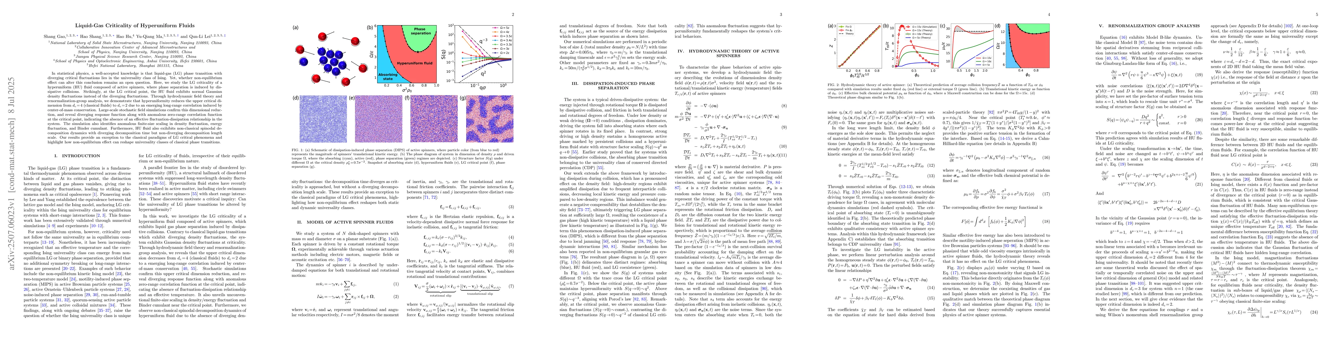 In statistical physics, a well-accepted knowledge is that liquid-gas (LG) phase transition with diverging critical fluctuations lies in the universality class of Ising model. Yet, whether non-equilibrium effect alone can alter this conclusion remains an open question. Here, we study the LG criticality of a hyperuniform (HU) fluid composed of active spinners, where phase separation is induced by dissipative collisions. Strikingly, at the LG critical point, the HU fluid exhibits normal Gaussian density fluctuations instead of the diverging fluctuations. Through hydrodynamic field theory and renormalization-group analysis, we demonstrate that hyperuniformity reduces the upper critical dimension from d_c = 4 (classical fluids) to d_c = 2 due to an emerging long-range correlation induced by center-of-mass conservation. Large-scale stochastic field simulations confirm this dimensional reduction, and reveal diverging response function along with anomalous zero-range correlation function at the critical point, indicating the absence of an effective fluctuation-dissipation relationship in the system. The simulation also identifies anomalous finite-size scaling in density fluctuation, energy fluctuation, and Binder cumulant. Furthermore, HU fluid also exihibits non-classical spinodal decomposition dynamics with diverging decomposition time but non-diverging decomposition length scale. Our results provide an exception to the classical paradigms of LG critical phenomena and highlight how non-equilibrium effect can reshape universality classes of classical phase transitions.