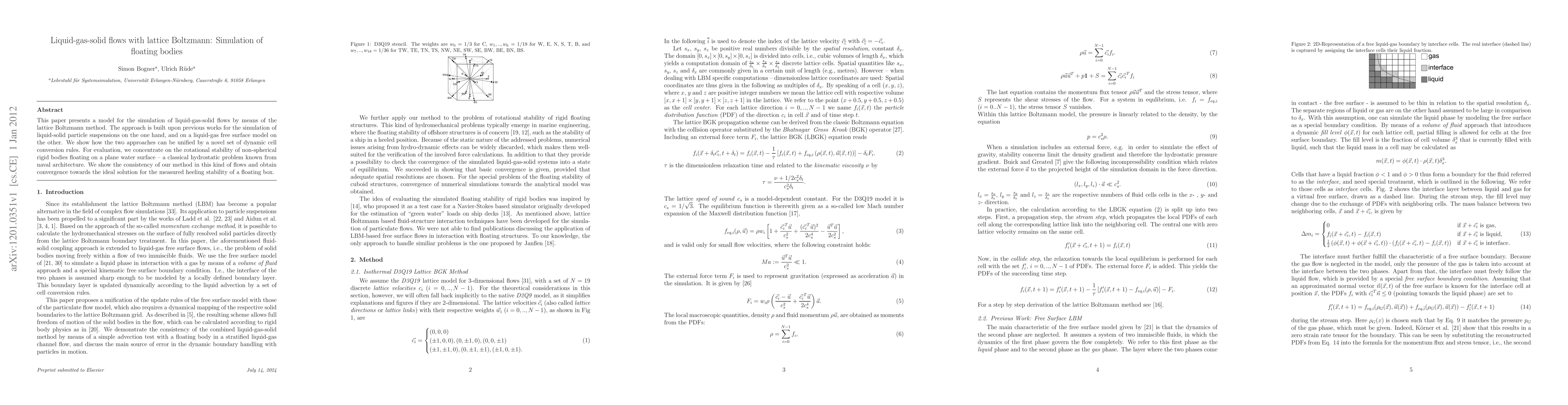 This paper introduces a lattice Boltzmann method for simulating liquid-gas-solid flows by merging models for liquid-solid suspensions and liquid-gas interfaces. It evaluates the method by analyzing the rotational stability of floating non-spherical bodies, achieving convergence with theoretical solutions for heeling stability.