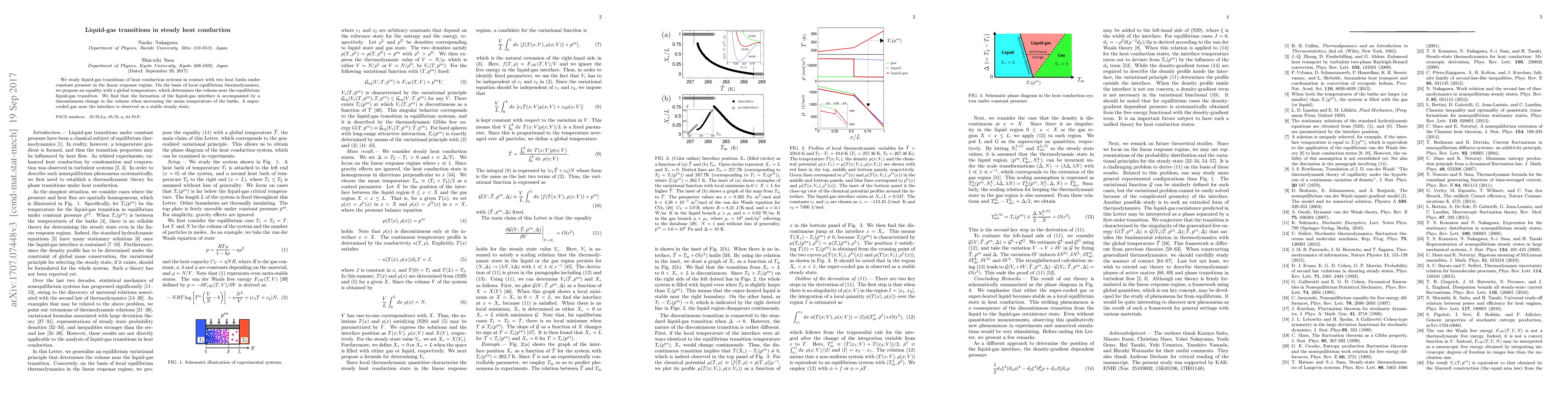 This paper investigates liquid-gas transitions in heat conduction systems with two heat baths, proposing a global temperature equality that determines volume changes near equilibrium. It finds a discontinuous volume change at the liquid-gas interface and identifies a stable super-cooled gas state near the interface.