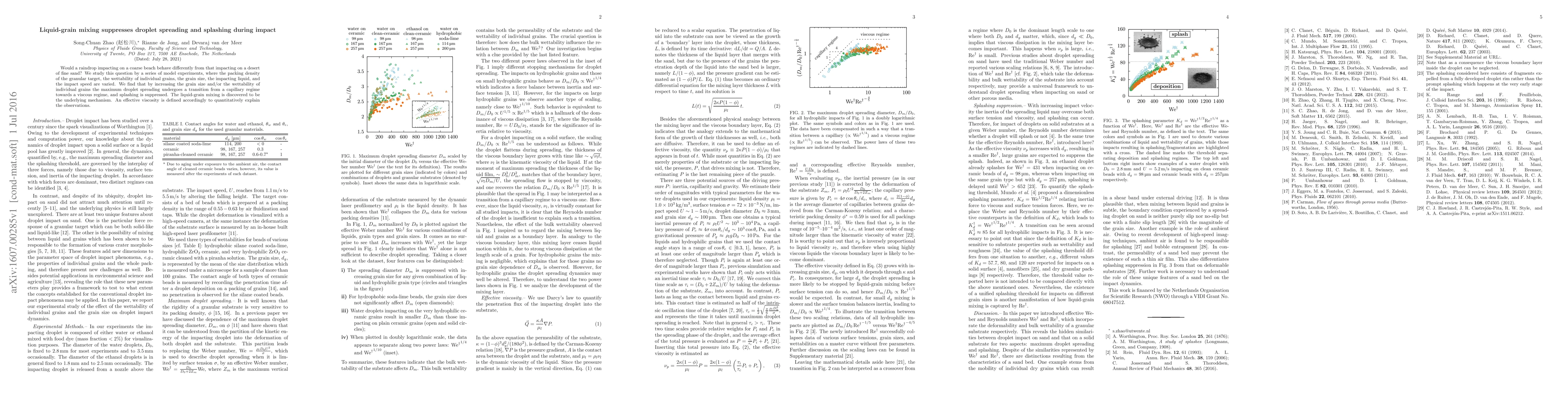 Would a raindrop impacting on a coarse beach behave differently from that impacting on a desert of fine sand? We study this question by a series of model experiments, where the packing density of the granular target, the wettability of individual grains, the grain size, the impacting liquid, and the impact speed are varied. We find that by increasing the grain size and/or the wettability of individual grains the maximum droplet spreading undergoes a transition from a capillary regime towards a viscous regime, and splashing is suppressed. The liquid-grain mixing is discovered to be the underlying mechanism. An effective viscosity is defined accordingly to quantitatively explain the observations.