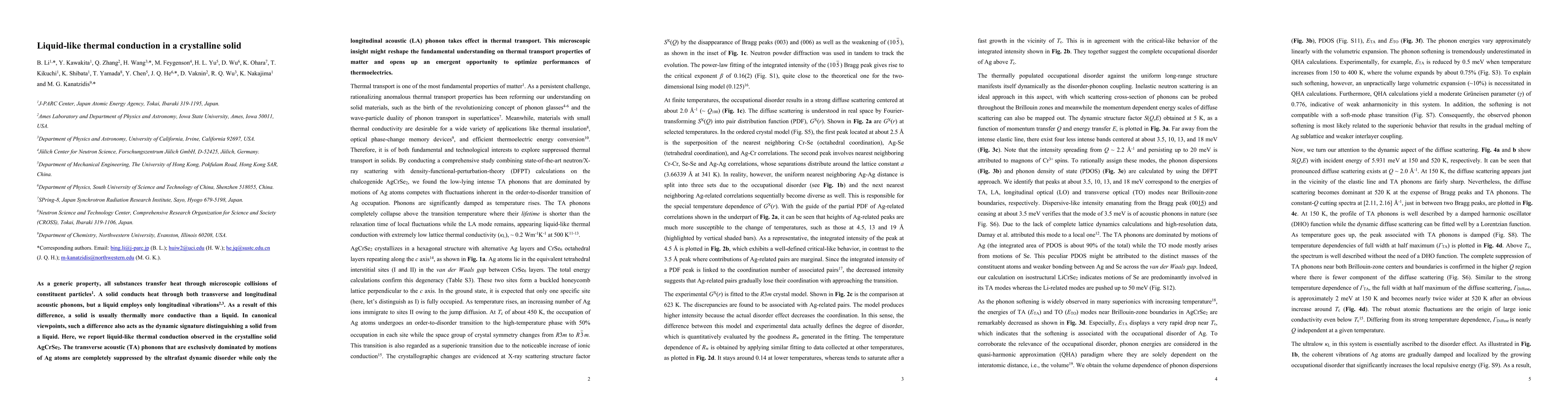 This paper reports that the crystalline solid AgCrSe2 exhibits liquid-like thermal conduction, primarily through longitudinal phonons, despite the presence of intense transverse phonons. The Ag atoms in the compound contribute to both phonon types, leading to unique thermal transport properties that challenge traditional understanding of heat conduction in solids.
