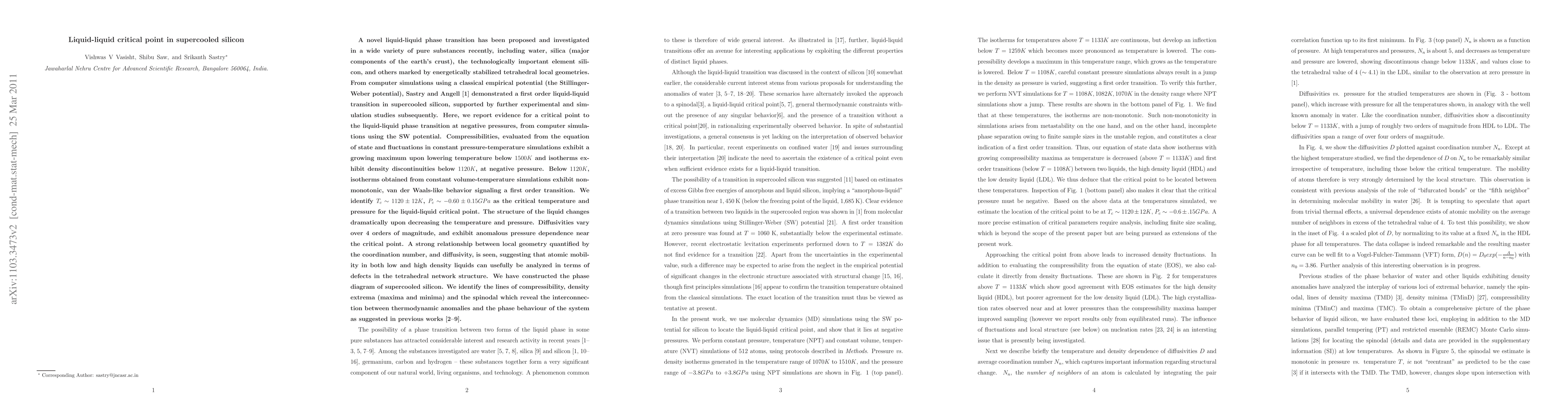 This research identifies a liquid-liquid critical end point in supercooled silicon at a critical temperature of ~1120 K and pressure of -0.60 GPa, using the Stillinger-Weber potential. The study reveals significant structural and thermodynamic anomalies, including non-monotonic isotherms and a strong relationship between atomic mobility and local geometry.