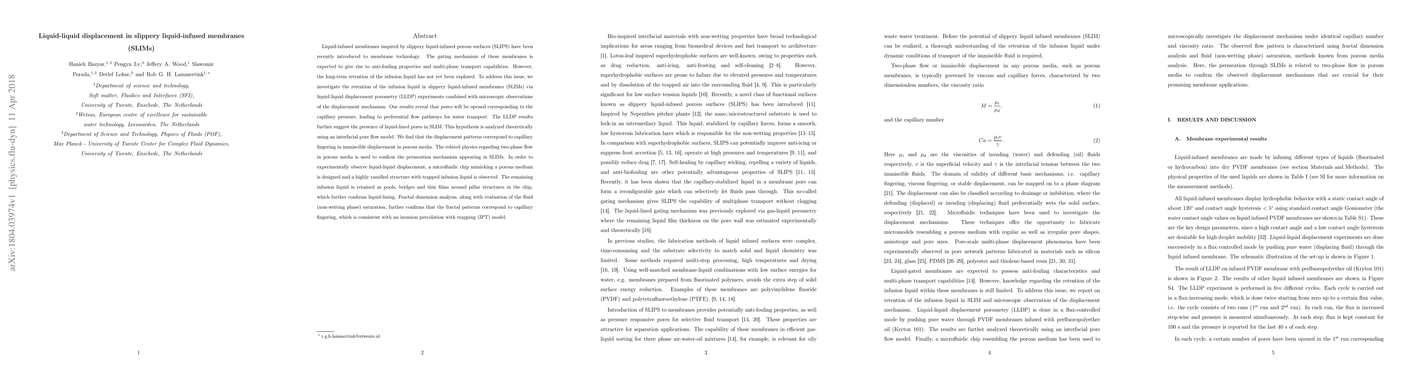 This paper investigates the long-term retention of infusion liquid in slippery liquid-infused membranes (SLIMs) using liquid-liquid displacement porometry (LLDP) and microfluidic chips. Results show that liquid-lined pores facilitate water transport through capillary fingering, with remaining infusion liquid forming pools and thin films, confirmed by fractal dimension analysis and invasion percolation with trapping (IPT) modeling.