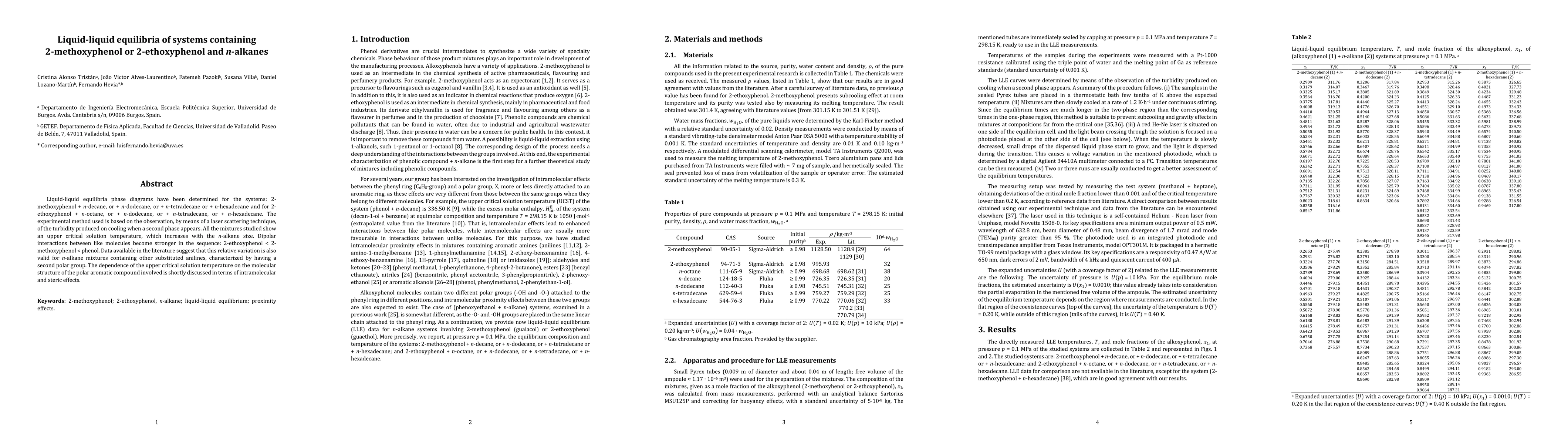 Liquid-liquid equilibria phase diagrams have been determined for the systems: 2-methoxyphenol + n-decane, or + n-dodecane, or + n-tetradecane or + n-hexadecane and for 2-ethoxyphenol + n-octane, or + n-dodecane, or + n-tetradecane, or + n-hexadecane. The experimental method used is based on the observation, by means of a laser scattering technique, of the turbidity produced on cooling when a second phase appears. All the mixtures studied show an upper critical solution temperature, which increases with the n-alkane size. Dipolar interactions between like molecules become stronger in the sequence: 2-ethoxyphenol < 2-methoxyphenol < phenol. Data available in the literature suggest that this relative variation is also valid for n-alkane mixtures containing other substituted anilines, characterized by having a second polar group. The dependence of the upper critical solution temperature on the molecular structure of the polar aromatic compound involved is shortly discussed in terms of intramolecular and steric effects.