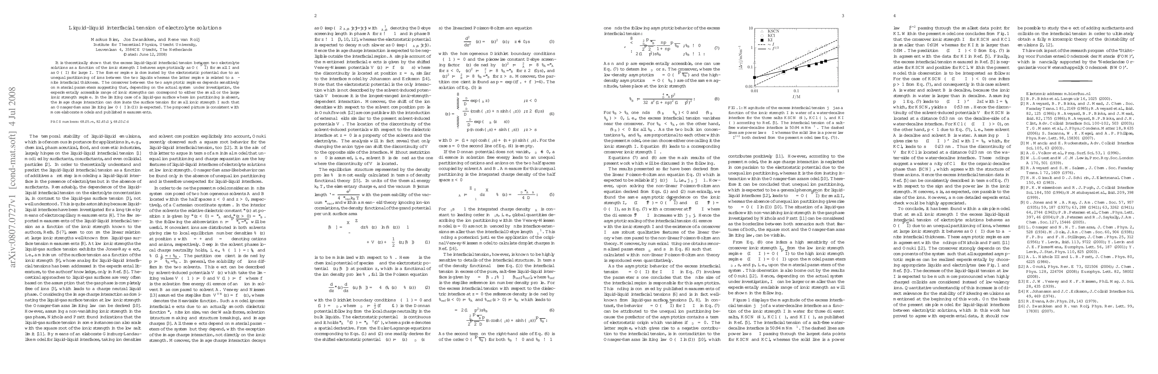This paper theoretically explores the behavior of liquid-liquid interfacial tension in electrolyte solutions, showing it follows O(-I^0.5) for small ionic strength and O(+-I) for large ionic strength, with the crossover dependent on material parameters. The study also discusses the Onsager-Samaras limiting law for liquid-gas surfaces.