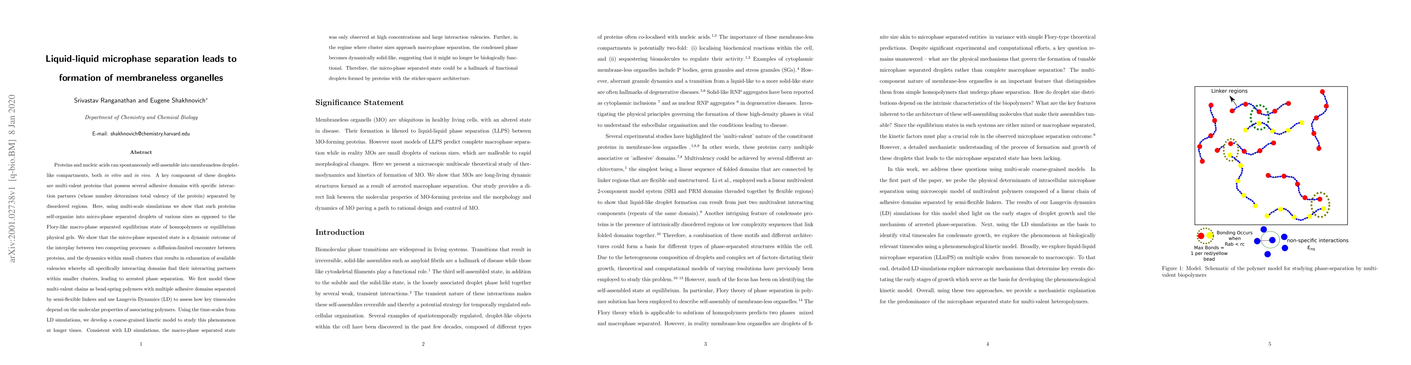 This paper demonstrates that multi-valent proteins self-organize into dynamic micro-phase separated droplets via a balance between diffusion-limited encounters and cluster dynamics, contrasting with the macro-phase separation seen in homopolymers. The micro-phase separated state is suggested to be functionally relevant, while macro-phase separation may render the droplets non-functional.