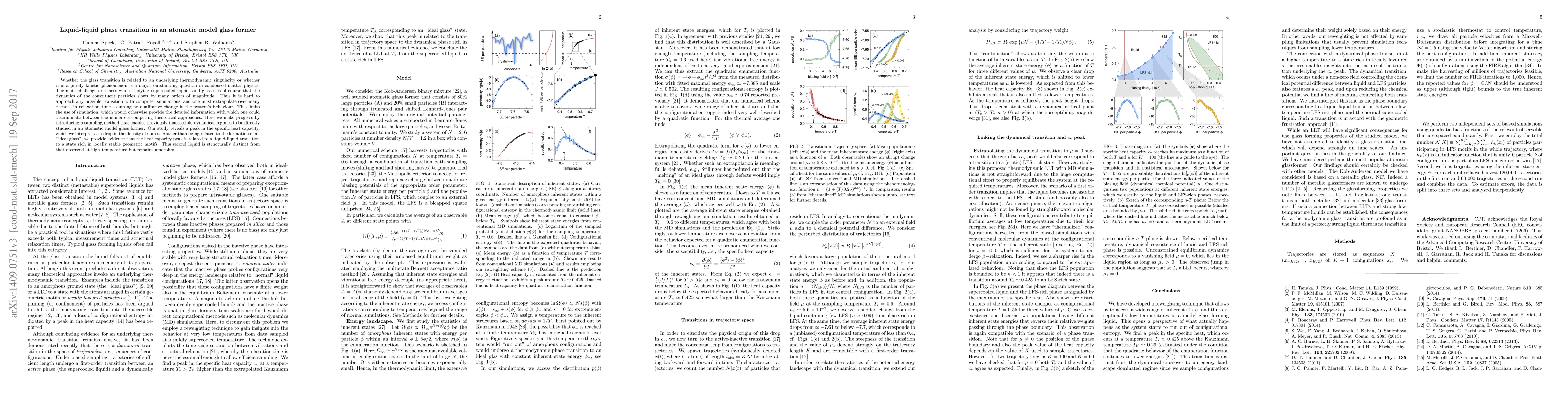 This paper investigates the glass transition in an atomistic model glass former, proposing a new sampling method to explore difficult-to-reach dynamical regimes. It finds a peak in specific heat indicating a density of states drop and evidence of a liquid-liquid phase transition linked to a dynamical phase transition.