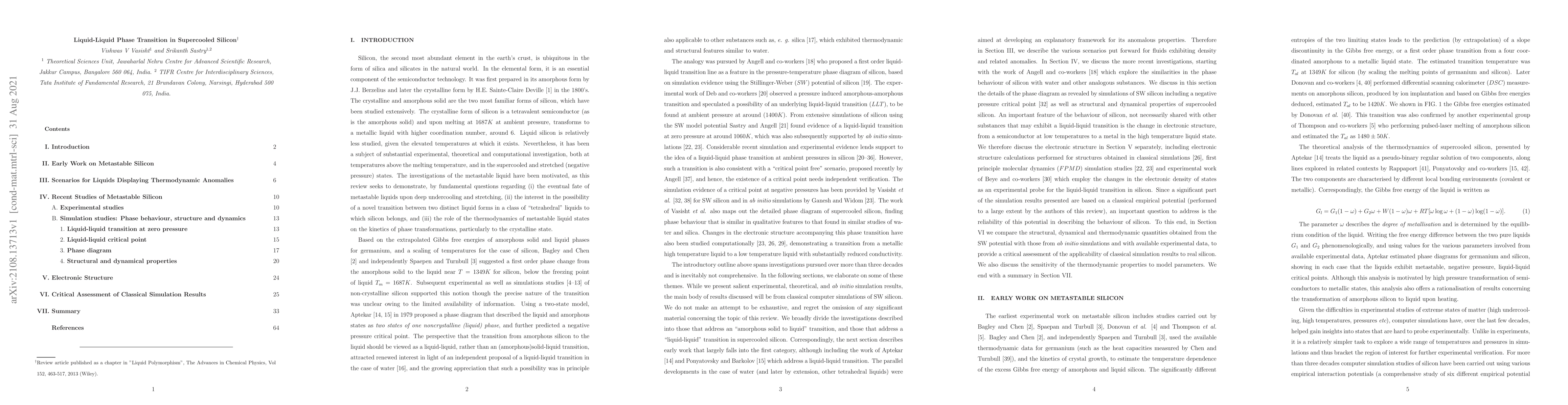 We present a review on the study of metastable silicon, primarily focusing mainly on the aspects of liquid-liquid transition, critical point and phase behaviour, structural and dynamic properties of liquid phase as well as crystal nucleation. We begin with an extensive survey of the investigations of liquid silicon pursued over three decades, with salient experimental, theoretical and simulation results. Following which we present various scenarios put forward to rationalize the density and related anomalies often observed in water and other network forming liquids. After which we present the more recent investigations (both simulation and experimental works) of the phase behavior of Silicon. Since a significant part of metastable silicon work is on a classical empirical potential an important question to address is the reliability of this potential in describing the behavior of silicon. To provide a critical assessment of the applicability of classical simulation results to real silicon we present a comparison of the structural, dynamical, and thermodynamic quantities obtained from the SW potential with those from ab initio simulations and with available experimental data. We also discuss the sensitivity of the thermodynamic properties to model parameters.