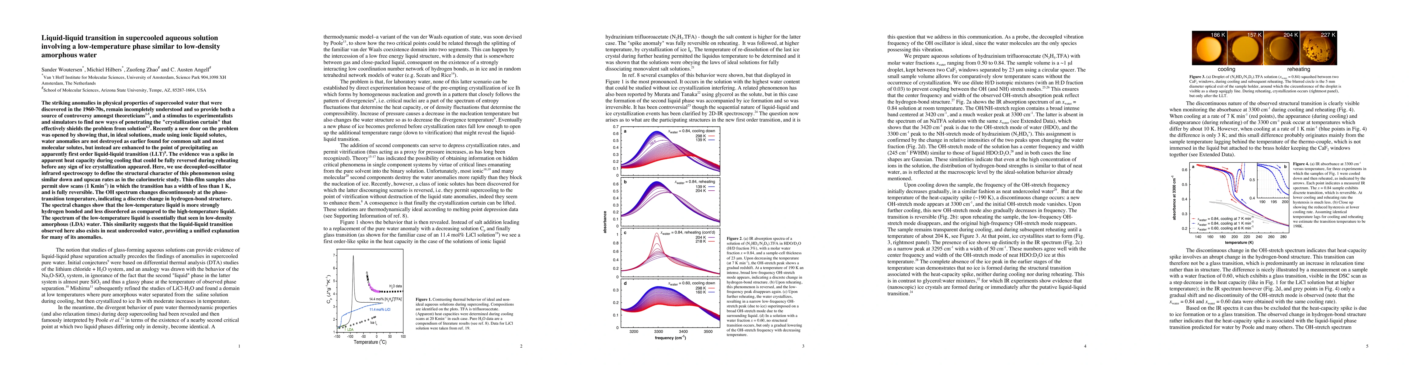 This study reveals a liquid-liquid transition in supercooled aqueous solutions involving ionic liquid solutes, characterized by a spike in heat capacity and a reversible phase change. Infrared spectroscopy shows a significant change in hydrogen-bond structure, indicating the low-temperature phase is more ordered and similar to low-density amorphous water.