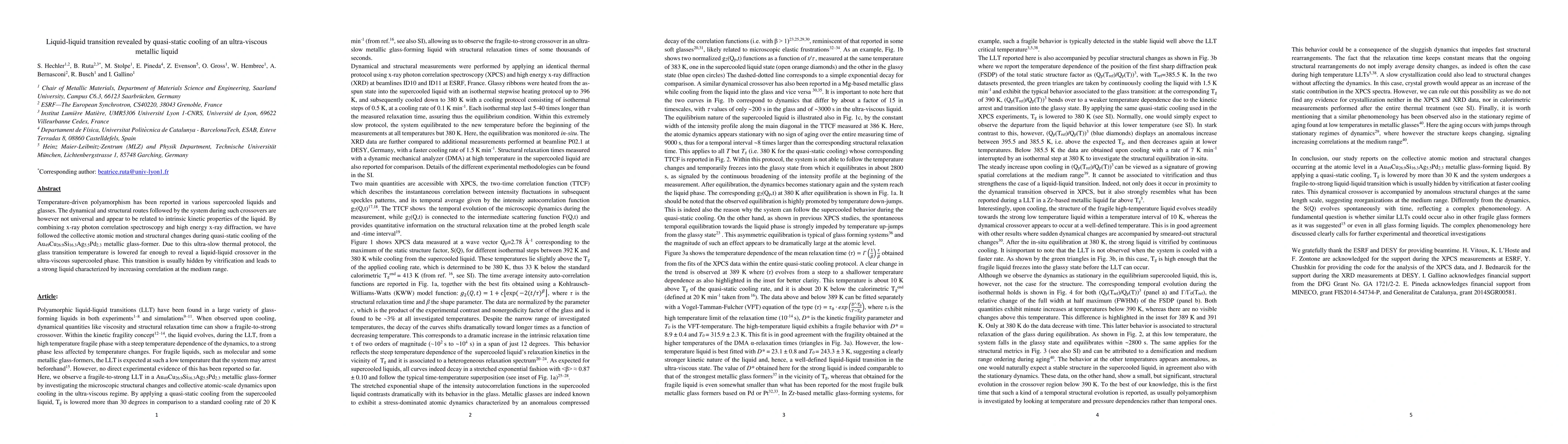 Temperature-driven polyamorphism has been reported in various supercooled liquids and glasses. The dynamical and structural routes followed by the system during such crossovers are however not universal and appear to be related to intrinsic kinetic properties of the liquid. By combining x-ray photon correlation spectroscopy and high energy x-ray diffraction, we have followed the collective atomic motion and structural changes during quasi-static cooling of the Au49Cu26.9Si16.3Ag5.5Pd2.3 metallic glass-former. Due to this ultra-slow thermal protocol, the glass transition temperature is lowered far enough to reveal a liquid-liquid crossover in the ultra-viscous supercooled phase. This transition is usually hidden by vitrification and leads to a strong liquid characterized by increasing correlation at the medium range.