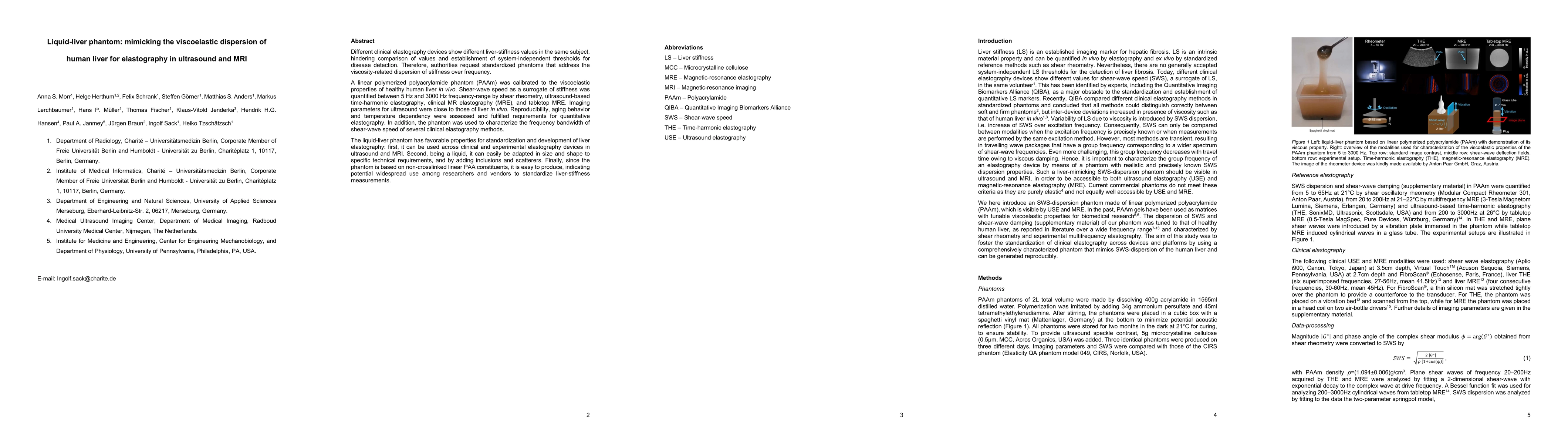 This paper describes the development of a liquid-liver phantom made from linear polymerized polyacrylamide to mimic the viscoelastic properties of human liver for elastography in ultrasound and MRI. The phantom's reproducibility, aging behavior, and temperature dependency were assessed, showing it can standardize liver-stiffness measurements across different elastography devices.