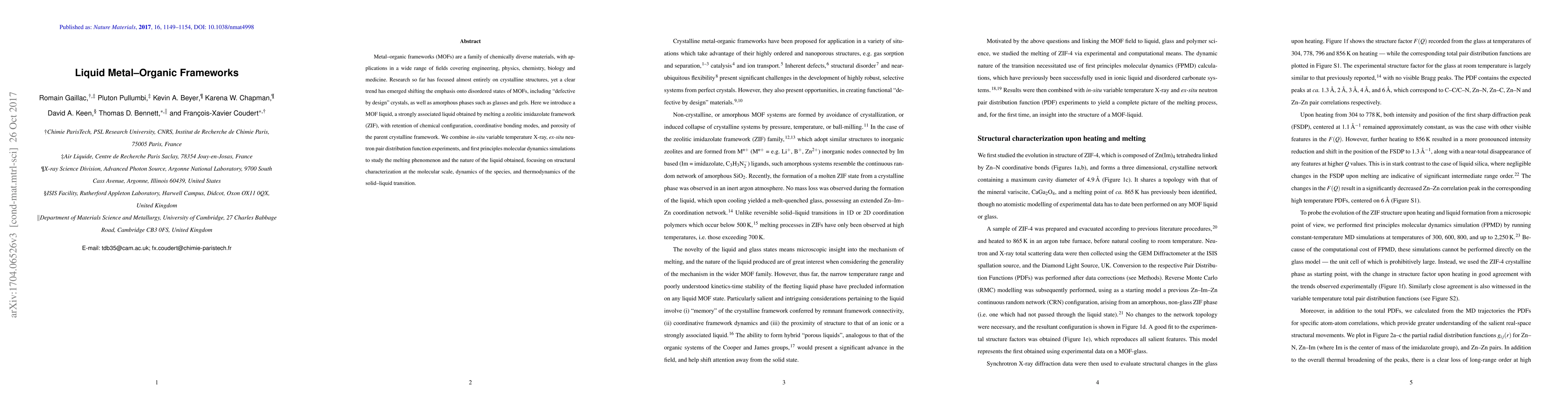 This paper introduces a novel liquid metal-organic framework (MOF) obtained by melting a zeolitic imidazolate framework (ZIF), maintaining its chemical configuration, bonding modes, and porosity. The study combines various experimental and computational techniques to characterize the liquid's structure, dynamics, and the thermodynamics of its solid-liquid transition.