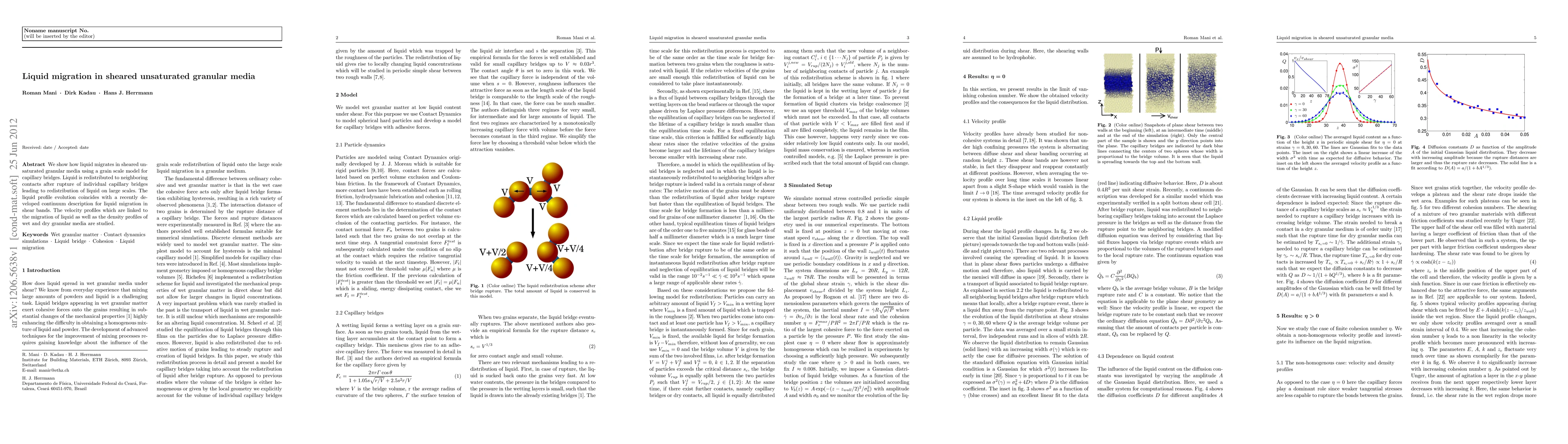 The paper presents a detailed grain-scale model for capillary bridges in unsaturated granular media under shear, linking micro-scale phenomena to macro-scale liquid migration patterns.