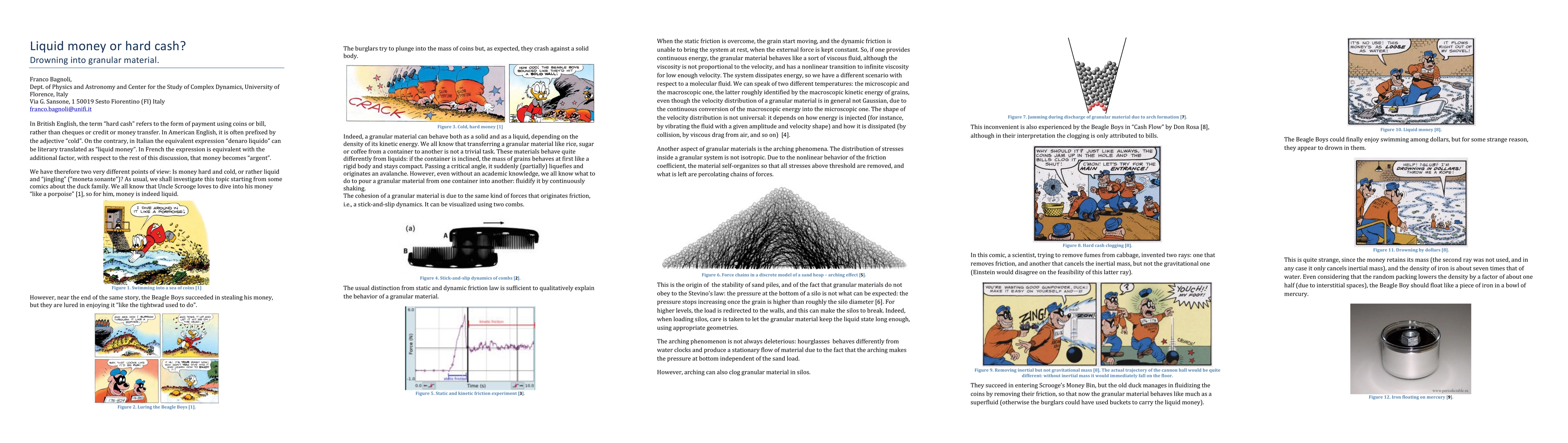 In British English, the term "hard cash" refers to the form of payment using coins or bill, rather than cheques or credit or money transfer. In American English, it is often prefixed by the adjective "cold". On the contrary, in Italian the equivalent expression "denaro liquido" can be literary translated as "liquid money". In French the expression is equivalent with the additional factor, with respect to the rest of this discussion, that money becomes "argent". We have therefore two very different points of view: Is money hard and cold, or rather liquid and "jingling" ("moneta sonante")? As usual, we shall investigate this topic starting from some comics about the duck family.