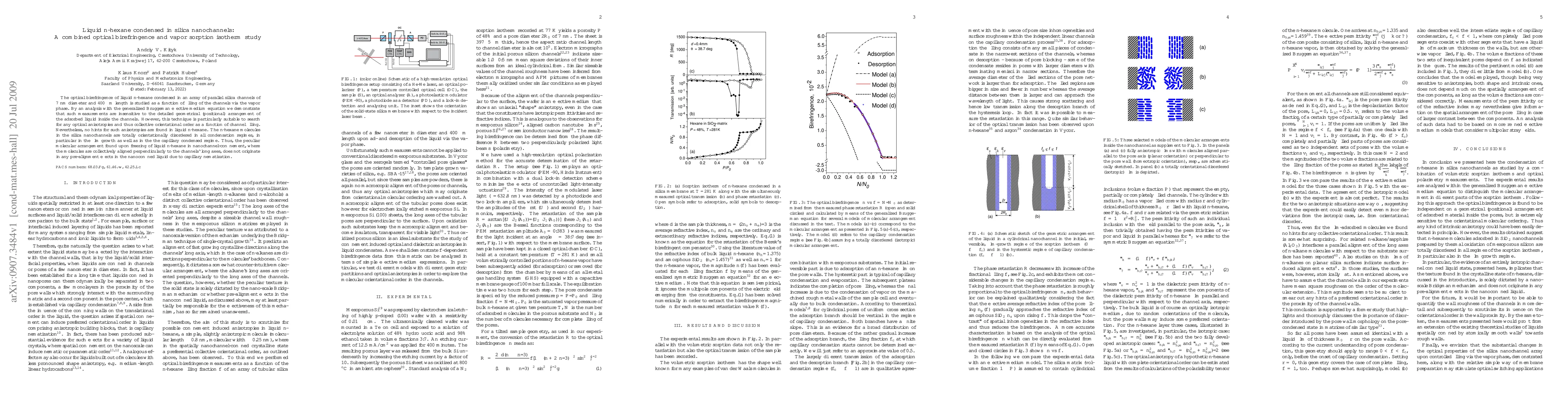 This study investigates the optical birefringence of liquid n-hexane in silica nanochannels using vapor sorption isotherms, revealing no optical anisotropies or collective orientational order. The findings suggest that n-hexane molecules remain orientationally disordered in all condensation regimes, refuting the hypothesis of capillary nematization.