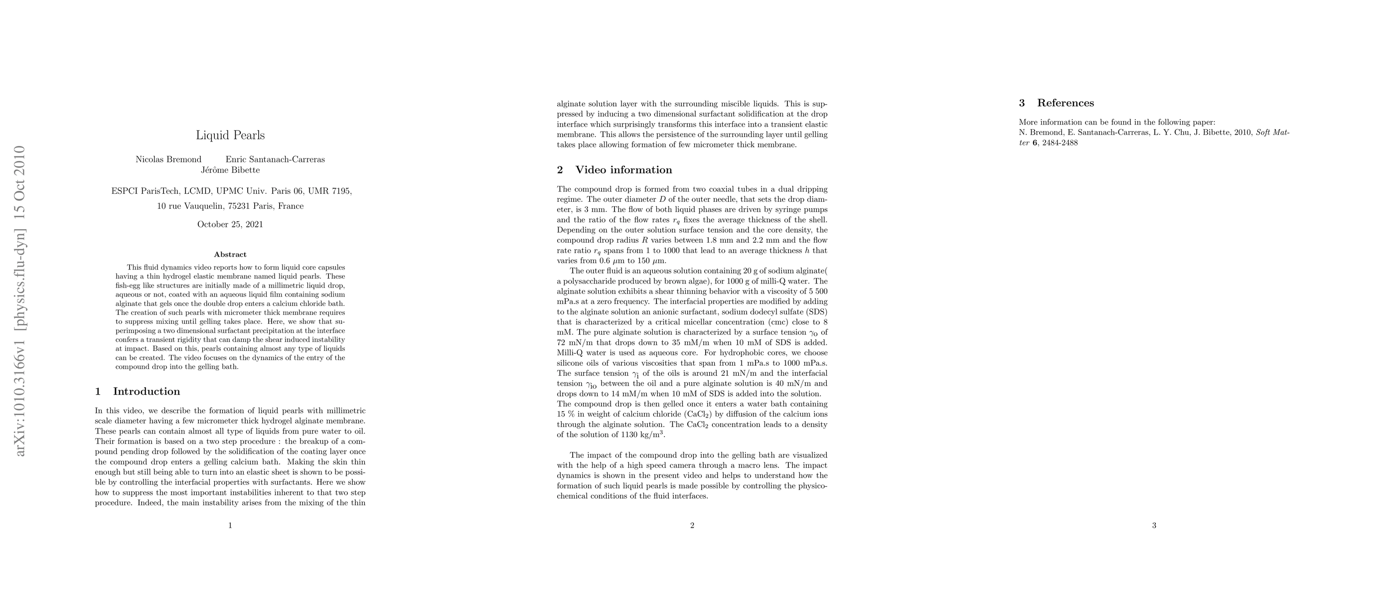 This fluid dynamics video reports how to form liquid core capsules having a thin hydrogel elastic membrane named liquid pearls. These fish-egg like structures are initially made of a millimetric liquid drop, aqueous or not, coated with an aqueous liquid film containing sodium alginate that gels once the double drop enters a calcium chloride bath. The creation of such pearls with micrometer thick membrane requires to suppress mixing until gelling takes place. Here, we show that superimposing a two dimensional surfactant precipitation at the interface confers a transient rigidity that can damp the shear induced instability at impact. Based on this, pearls containing almost any type of liquids can be created. The video focuses on the dynamics of the entry of the compound drop into the gelling bath.