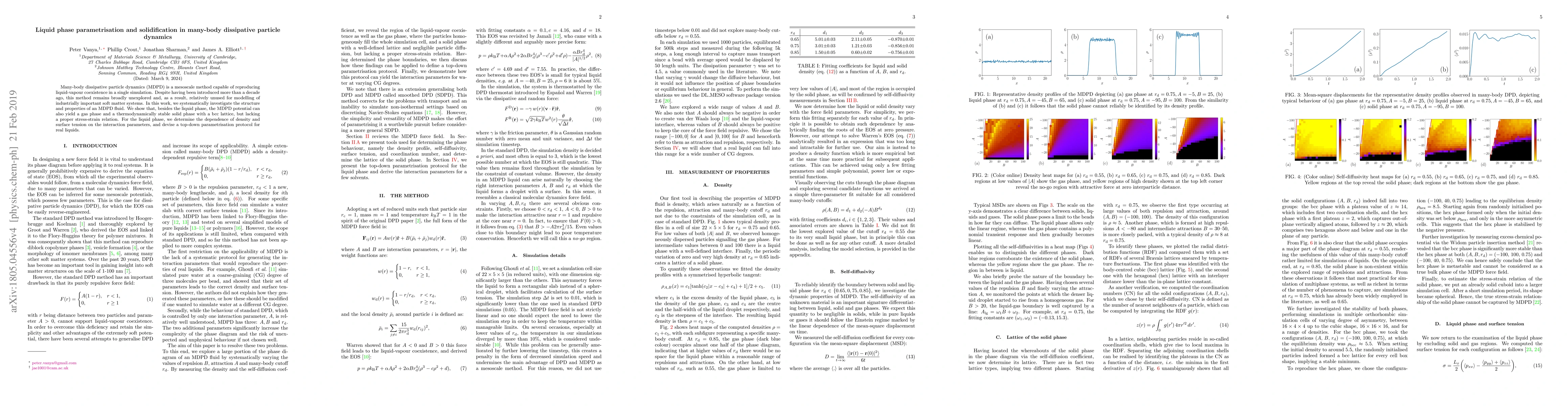 This paper explores the many-body dissipative particle dynamics (MDPD) method, demonstrating its ability to model not just liquid but also gas and solid phases. It establishes a parametrisation protocol for real liquids based on density and surface tension dependencies, though the solid phase lacks a proper stress-strain relation.