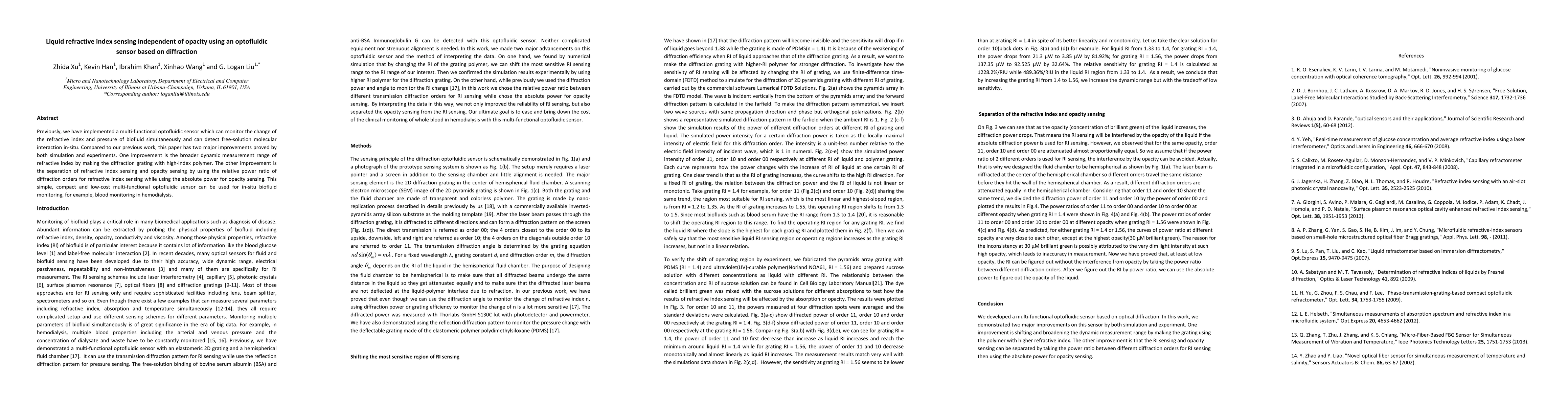 We have implemented a multi-functional optofluidic sensor that can monitor changes in the refractive index and pressure of biofluid simultaneously and can detect free-solution molecular interaction in-situ. In this paper, we demonstrate two major improvements of this sensor proven by both simulation and experiments. One improvement is the broader measurement range of refractive index by making the diffraction grating with high-index polymer. The other improvement is the separation of refractive index sensing from opacity sensing by using the relative power ratio of diffraction orders. This simple, compact and low-cost multi-functional optofluidic sensor has the potential to be used for in-situ biofluid monitoring.