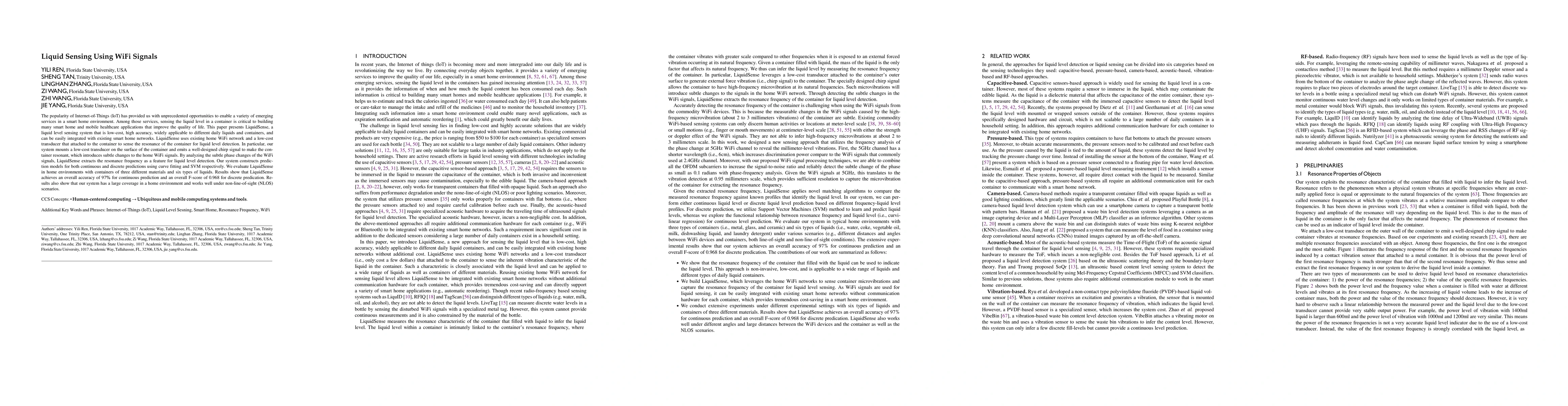 The research introduces LiquidSense, a WiFi-based system for accurately detecting liquid levels in various containers using a low-cost transducer. It achieves high accuracy (97% for continuous prediction, F-score of 0.968 for discrete prediction) and works well in home environments, including non-line-of-sight scenarios, without requiring additional infrastructure.