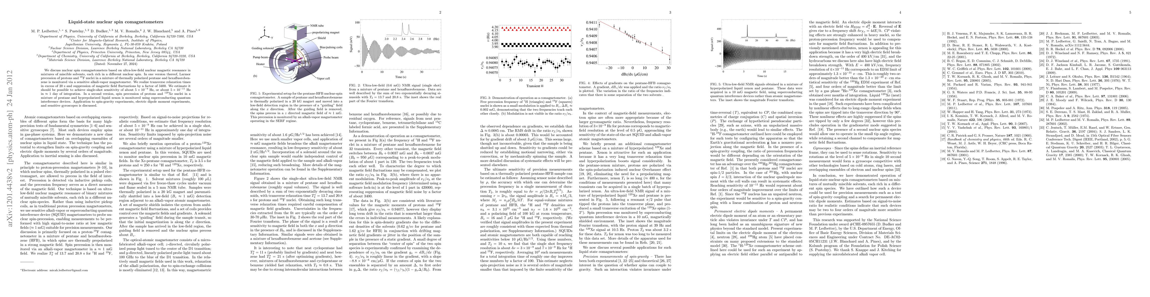 We discuss nuclear spin comagnetometers based on ultra-low-field nuclear magnetic resonance in mixtures of miscible solvents, each rich in a different nuclear spin. In one version thereof, Larmor precession of protons and ${\rm ^{19}F}$ nuclei in a mixture of thermally polarized pentane and hexafluorobenzene is monitored via a sensitive alkali-vapor magnetometer. We realize transverse relaxation times in excess of 20 s and suppression of magnetic field fluctuations by a factor of 3400. We estimate it should be possible to achieve single-shot sensitivity of about $5\times{\rm 10^{-9} Hz}$, or about $5\times 10^{-11} {\rm Hz}$ in $\approx 1$ day of integration. In a second version, spin precession of protons and ${\rm ^{129}Xe}$ nuclei in a mixture of pentane and hyperpolarized liquid xenon is monitored using superconducting quantum interference devices. Application to spin-gravity experiments, electric dipole moment experiments, and sensitive gyroscopes is discussed.